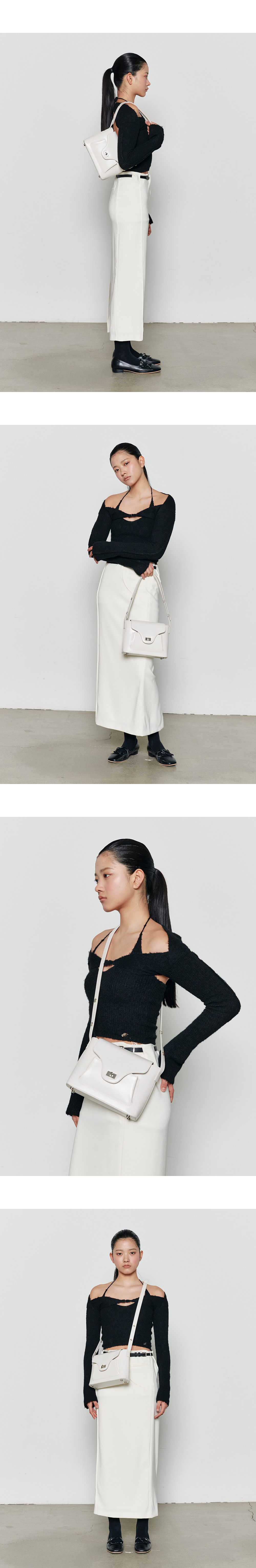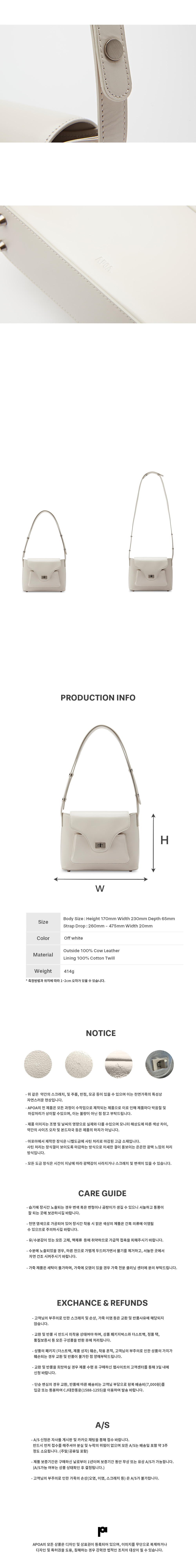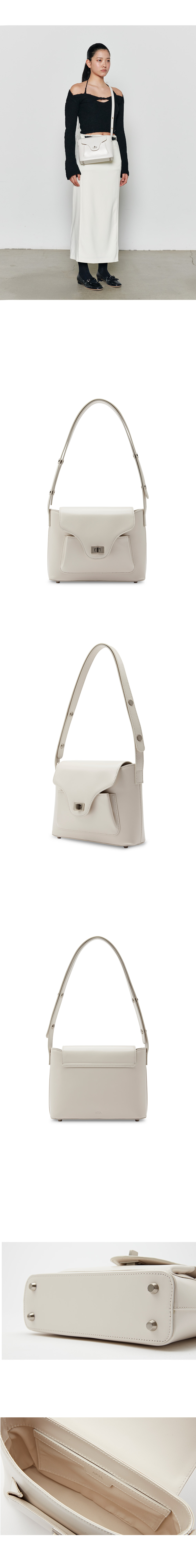 아포아 시그니처 디자인 PAO line 백으로 포멀하면서도 클래식한 라인의 백입니다. 빈티지한 무드의 바디 디자인과 Pao 라인만의 중앙 디테일이 더해진 백으로 구조적인 형태로 제작되었습니다. 스트랩은 클래식한 무드의 스냅을 사용하여 2단계 길이 조정이 가능하며, 숄더 혹은 크로스백으로 다양한 무드를 연출하실 수 있습니다. 이태리 수입 가죽을 사용하여 부드러운 터치감과 은은한 광택이 매력적인 백으로 사틴 도금 장식을 활용하여 빈티지한 무드를 연출하였습니다. 중앙 수납과 앞 포켓의 수납이 가능하여 수납의 용이성을 더하였습니다.