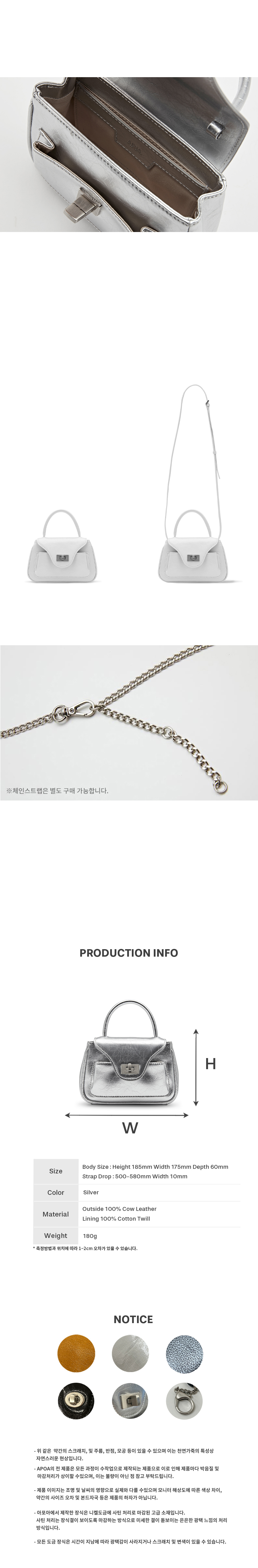 아포아의 시그니처 라인인 Pao 시리즈의 축소판 디자인으로 컴팩트한 사이즈의 mini Bag입니다. 아포아만의 Pao 시그니처 디자인으로 미니멀하면서도 빈티지한 무드를 살려 제작되었습니다. 컴팩트한 사이즈지만 아웃포켓과 넉넉한 내부 수납공간이 있어 가벼운 소지품 수납에 용이합니다. 기본으로 제공되는 레더 스트랩과 옵션인 체인 스트랩으로 토트, 숄더, 크로스 3way로 다양한 무드를 연출하실 수 있는 bag입니다.