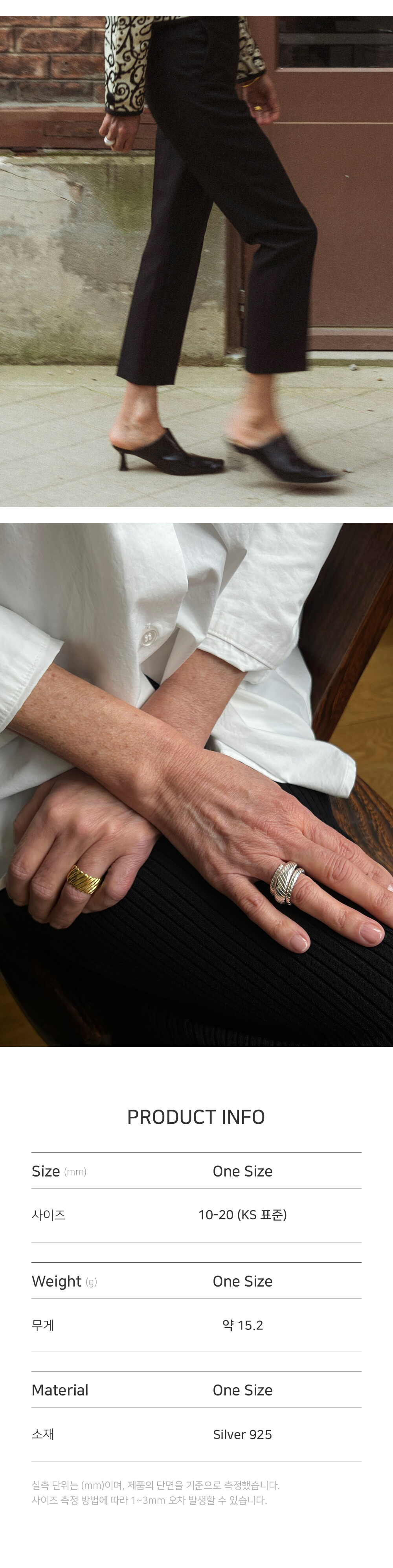 세 개의 링을 낀 듯한 느낌을 주며 윗 면은 세 줄로 보이지만 손가락 안쪽 부분은 두 줄로 얇아져서 볼륨감 대비 편하게 착용하시기 좋습니다. 볼드한 실버의 청량한 느낌이 돋보이는 제품입니다. 남녀 구분 없이 착용하기 좋아서 추천드립니다. 마망에필레는 오더메이드 방식으로 주문 후 교환 및 환불이 불가합니다. 제작 기간은 주말과 공휴일을 제외하고 10-14일 소요됩니다. 샘플과 최대한 같은 형태로 제작하고 있으나 핸드메이드 특성상 근소한 차이가 있을 수 있습니다. 기타 문의사항은 CS 010 8468 3791 또는 카카오톡 mamanetfille으로 연락 주시기 바랍니다. 빠른 기간 내에 받아 보셔야 하는 경우에는 CS 010 8468 3791로 문의하시기 바랍니다.