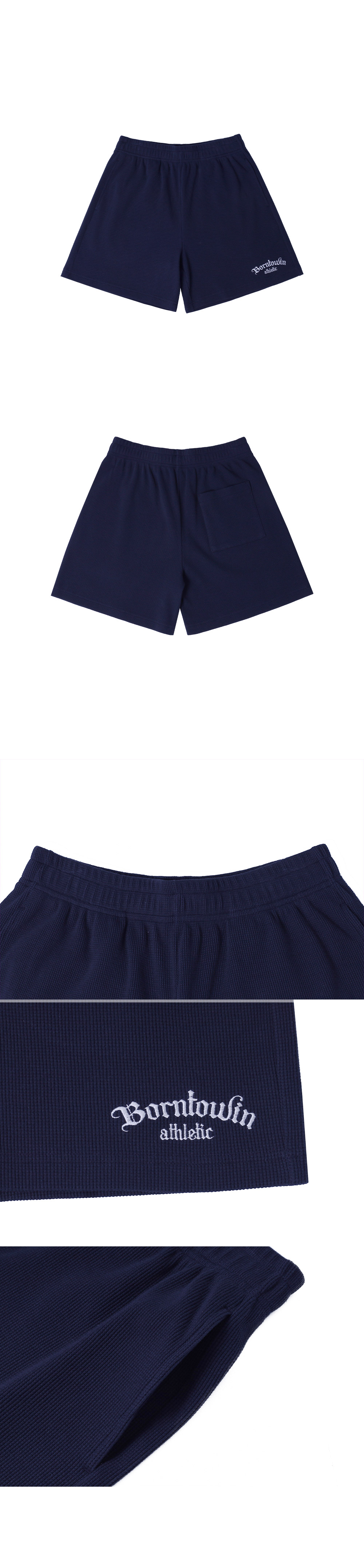 [DETAILS] * 와플 하프 팬츠 SHORT VER. - 통기성 좋은 와플 조직 - 전면 하단 레터링 자수 디테일 - 활동성 좋은 숏기장 하프 팬츠 Material :COTTON 80% POLYESTER 15%POLYURETHANE 5% Fitting : 1 Size, 172cm, 74kg