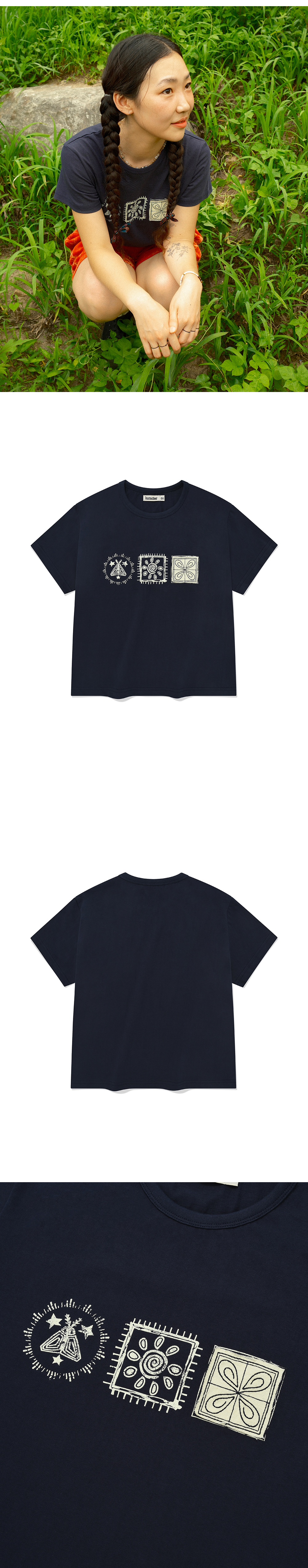 카락터 우먼 스탬프 크롭 하프 티셔츠 네이비