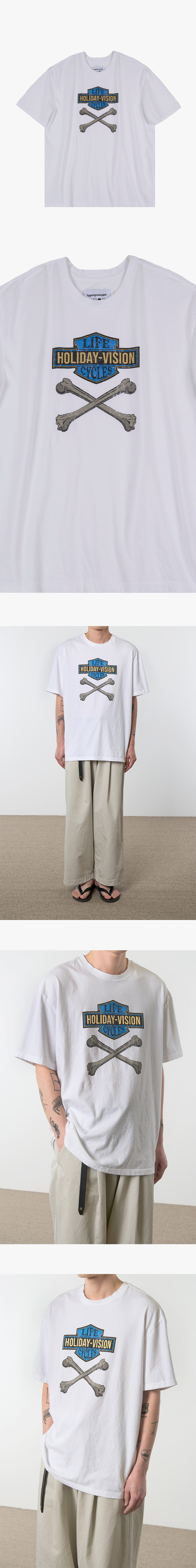 2024년 타이핑 미스테이크의 HOLIDAY-VISION 패러디는 디렉터가 소장한 오래된 빈티지 할리데이비슨 바이커 재킷이 모티브가 되었습니다. 어느날 여행 계획을 세우던 시점에 우연히 눈에 띄인 할리데이비슨 재킷을 보고 단어를 흥얼거리던 중 '홀리데이비전(여행계획)' 이라는 재미있는 단어를 떠올린 것이 아이디어의 첫 시작이었으며, 빈티지 할리데이비슨 그래픽을 오마주하여 타이핑 미스테이크의 시선에서 흥미롭게 풀어낸 아트워크가 특징인 제품입니다. 낙낙한 실루엣과 탄탄하게 짜여진 20수 1합 면 소재를 채택하여 오랜 세월을 지낸듯한 빛 바랜 모습은 후가공으로 자연스럽게 표현하였습니다. 후가공을 통해 세탁시 수축 또한 최소화한 것이 특징이며, 경우에 따라 이너로, 한 여름엔 단품으로 활용해도 손색이 없는 두께감의 제품입니다.