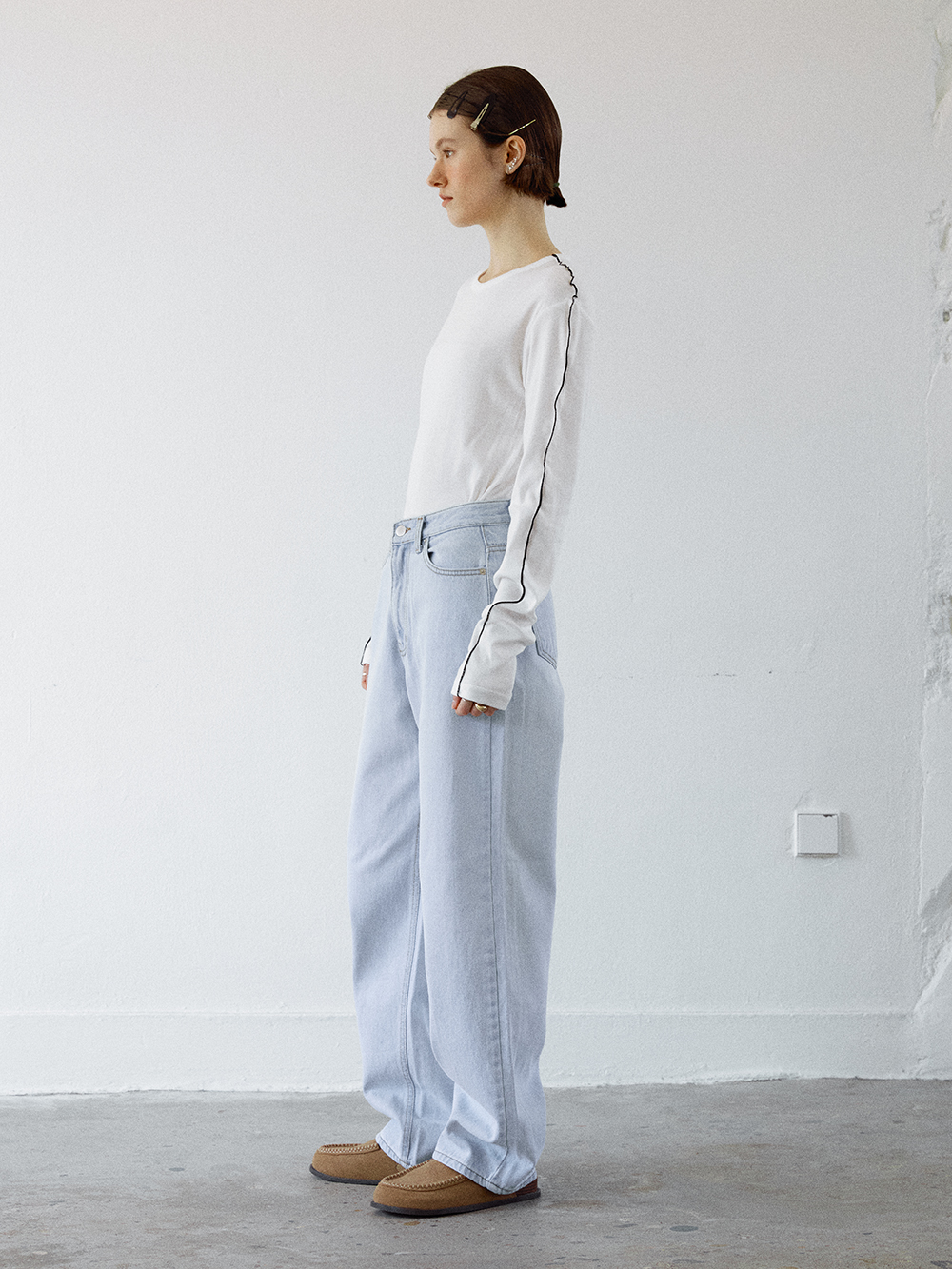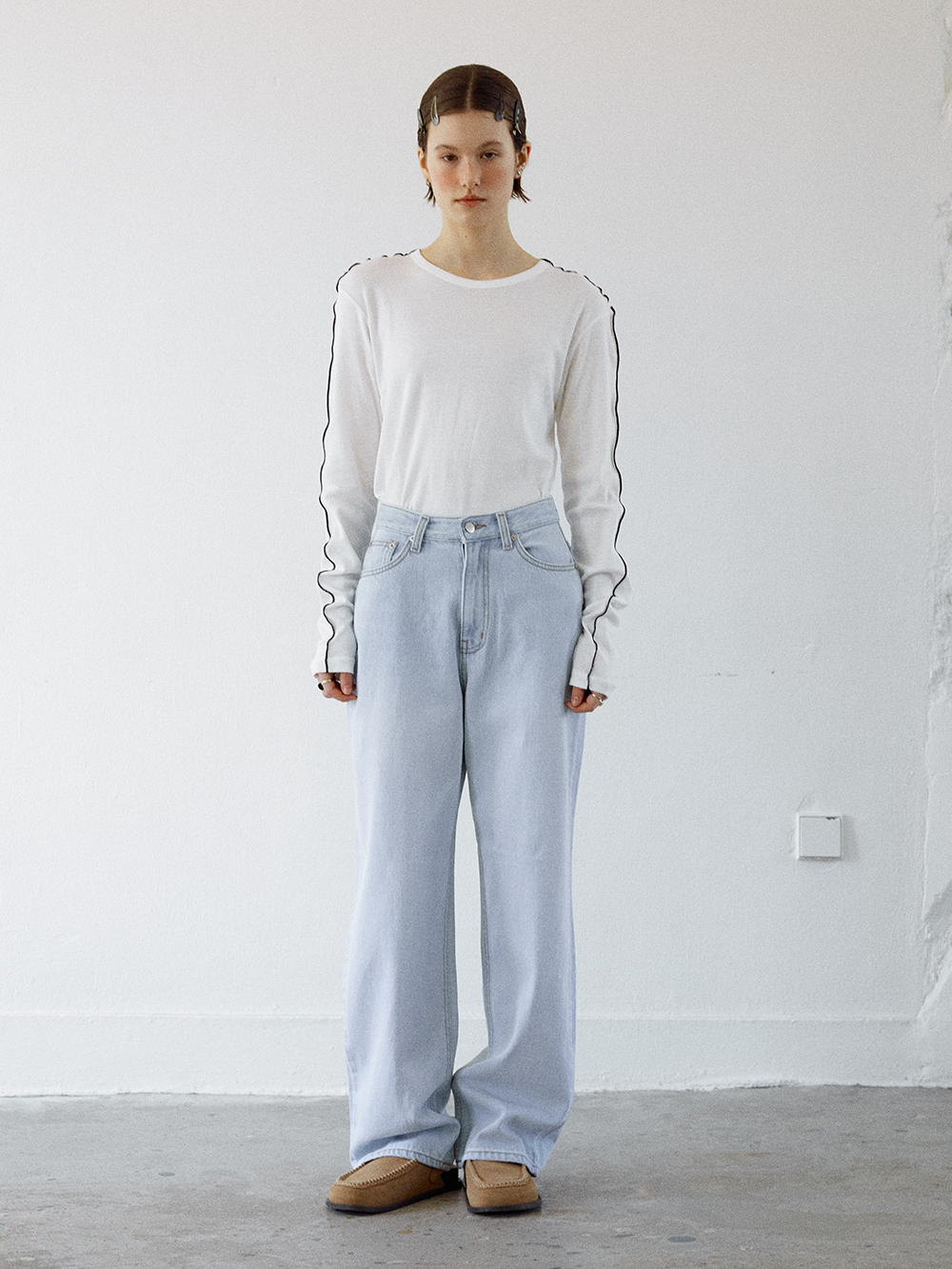 2024 SPRING COLLECTION - 워싱 가공된 루즈한 실루엣의 데님팬츠 - YKK사의 바지지퍼 - 전면의 은은한 브러시 디테일 - 전면의 은은한 중심줄의 워싱 디테일 - COTTON 100% - Made in korea +COLOR MID BLUE, LIGHT BLUE +CARE Dry cleaning , 단독 찬물세탁 권장 +MODEL SIZE 172cm / 49kg Model(Female) wears size Small