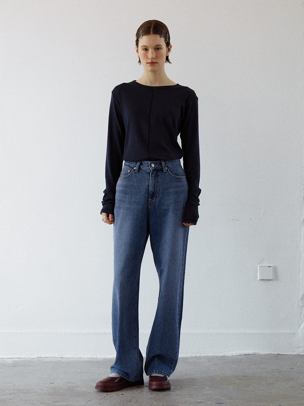2024 SPRING COLLECTION - 워싱 가공된 루즈한 실루엣의 데님팬츠 - YKK사의 바지지퍼 - 전면의 은은한 브러시 디테일 - 전면의 은은한 중심줄의 워싱 디테일 - COTTON 100% - Made in korea +COLOR MID BLUE, LIGHT BLUE +CARE Dry cleaning , 단독 찬물세탁 권장 +MODEL SIZE 172cm / 49kg Model(Female) wears size Small