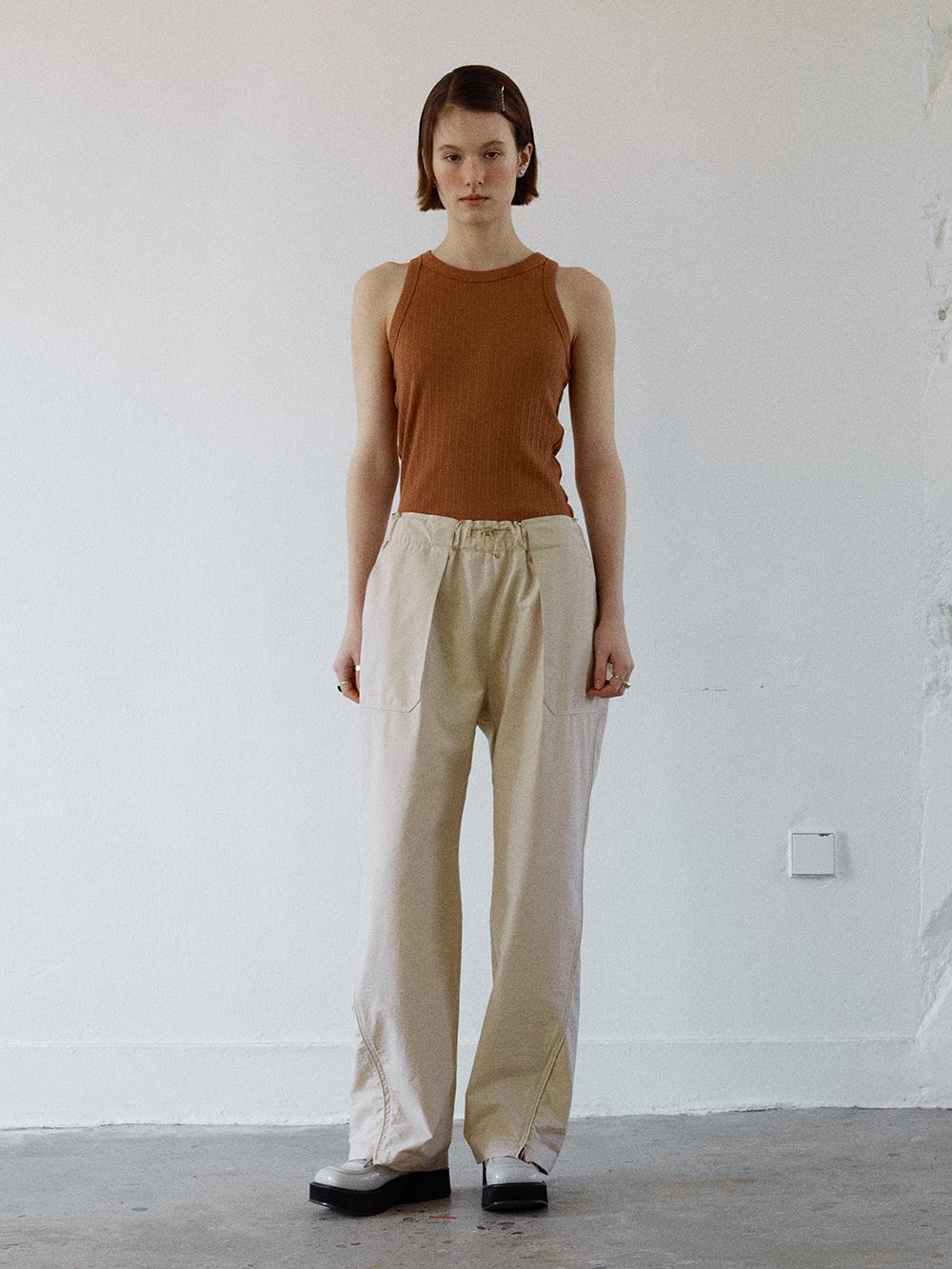 2024 SPRING COLLECTION - COTTON, NYLON 혼방의 루즈 핏의 밴딩팬츠 - 옆선부터 내려오는 곡선라인의 트리밍 디테일 - 전면의 지퍼여밈을 통한 트임디테일 - 전면의 아우포켓 디테일 - YKK사의 스토퍼, 혼솔망사지퍼 - Made in korea +COLOR LIGHT BEIGE +CARE Dry cleaning only +MODEL SIZE 172cm / 49kg Model(Female) wears size Free