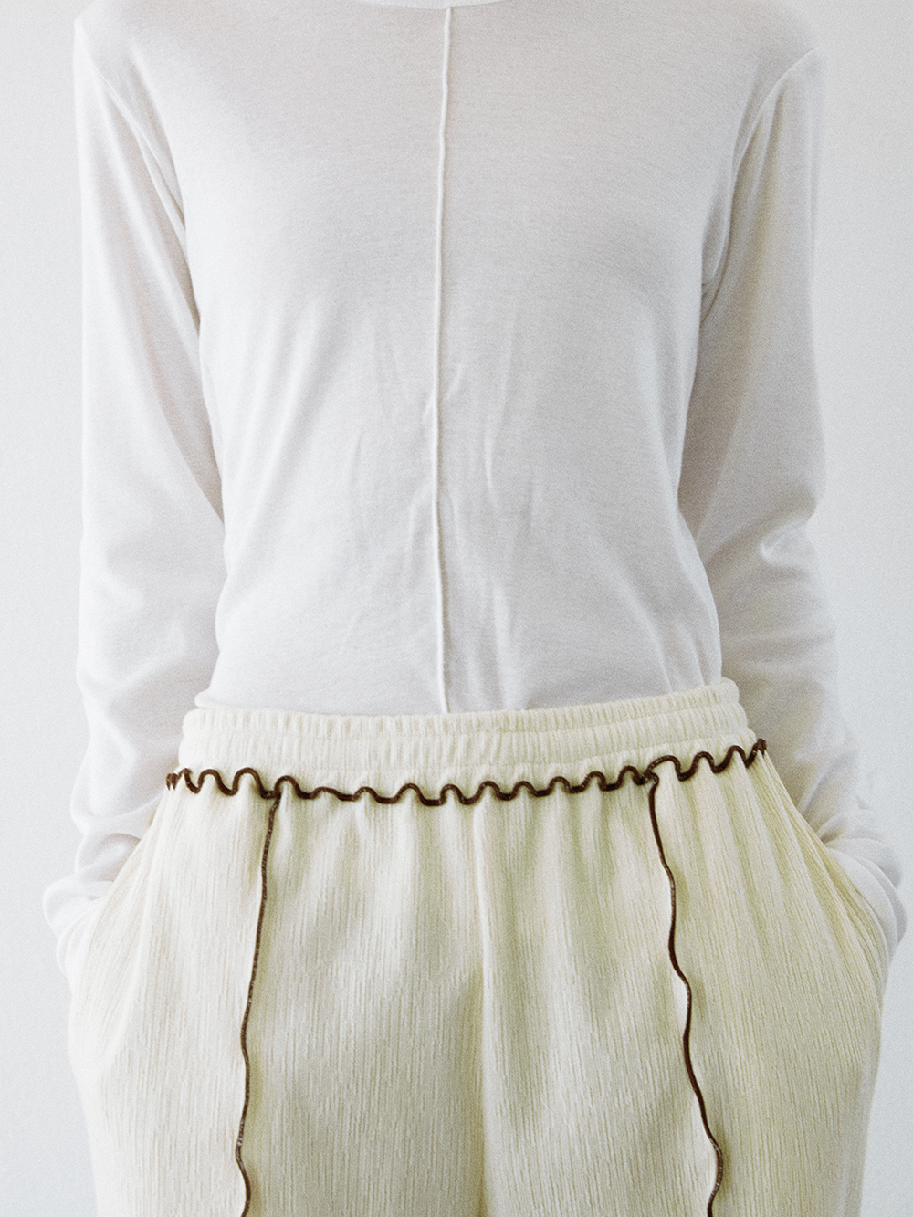 2024 SPRING COLLECTION - COTTON, POLY 혼방의 밴딩팬츠 - 밴딩절개, 전면 배색 스티치 트리밍 디테일 - 독특한 골지느낌의 소재감 - Made in korea +COLOR CREAM, BLACK +CARE Dry cleaning , 단독 찬물세탁 권장 +MODEL SIZE 172cm / 49kg Model(Female) wears size Free