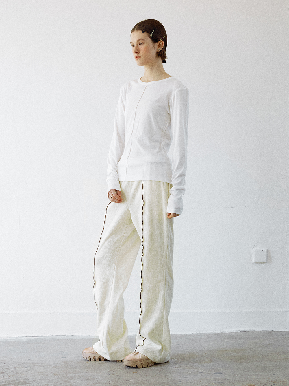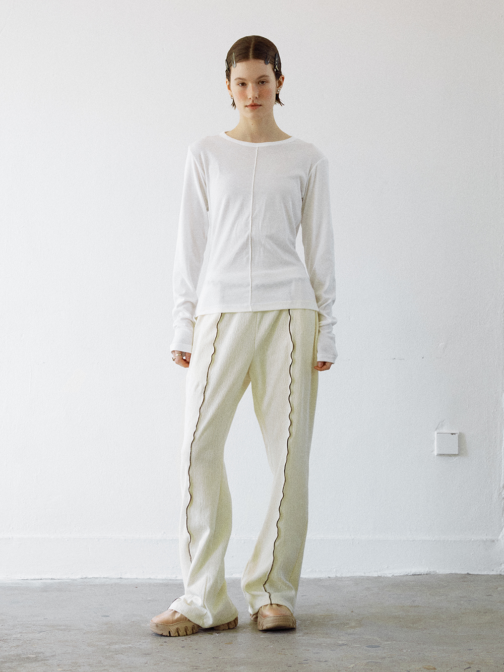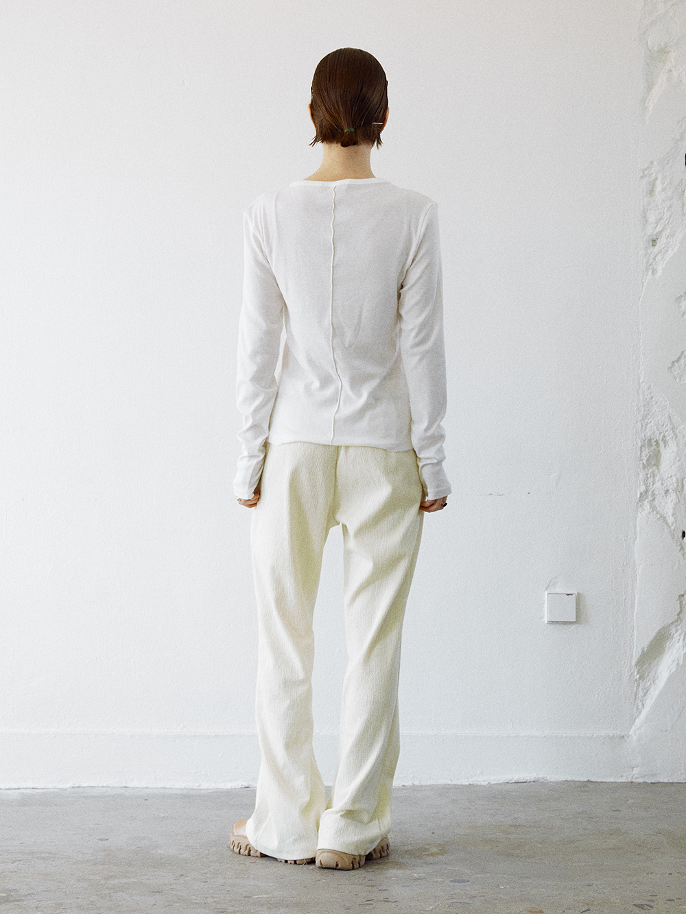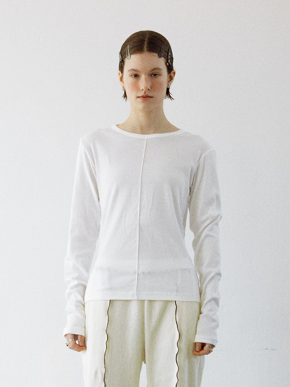 2024 SPRING COLLECTION - COTTON, MODAL 혼방의 롱 슬리브 티셔츠 - 전,후면의 스티치 트리밍 디테일 - MODAL 특유의 부드러운 터치감 - Made in korea +COLOR BLUE, OFF WHITE, NAVY +CARE Dry cleaning , 단독 찬물세탁 권장 +MODEL SIZE 172cm / 49kg Model(Female) wears size Free