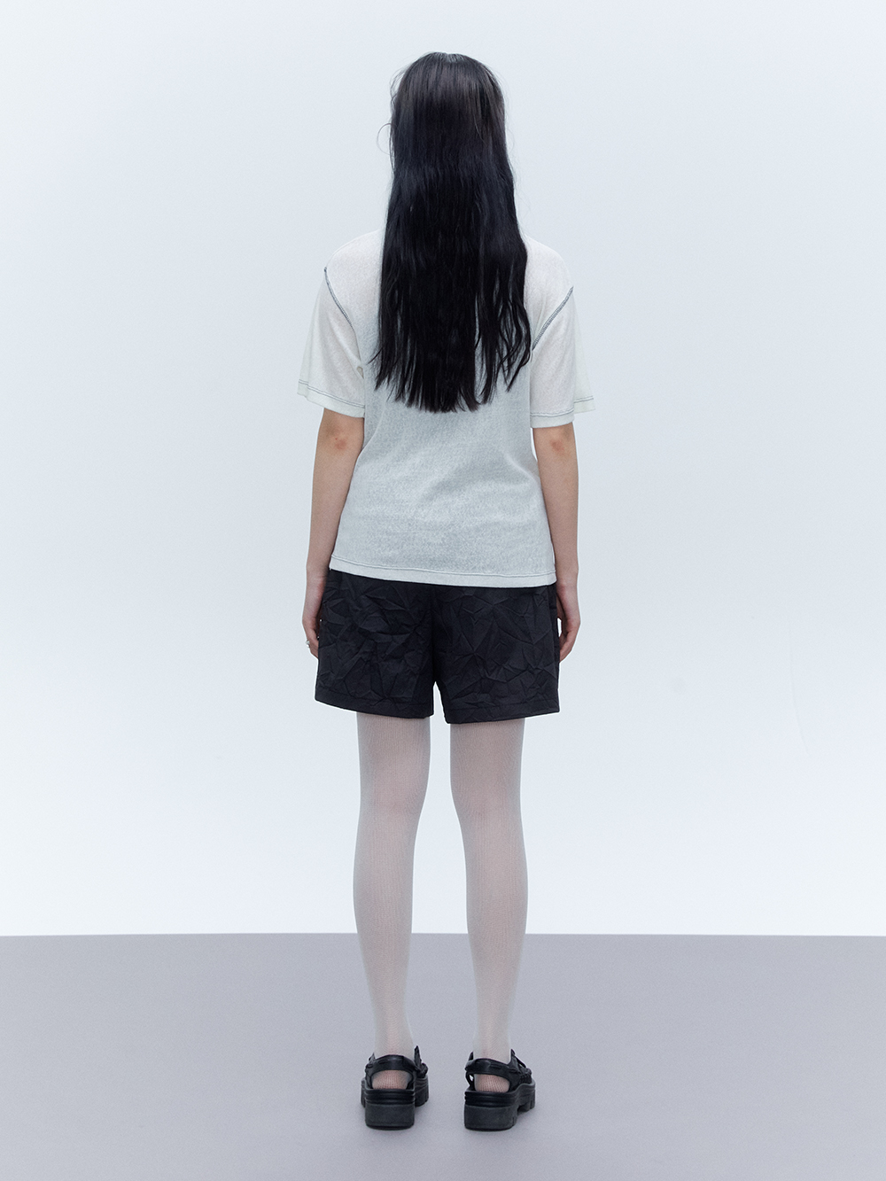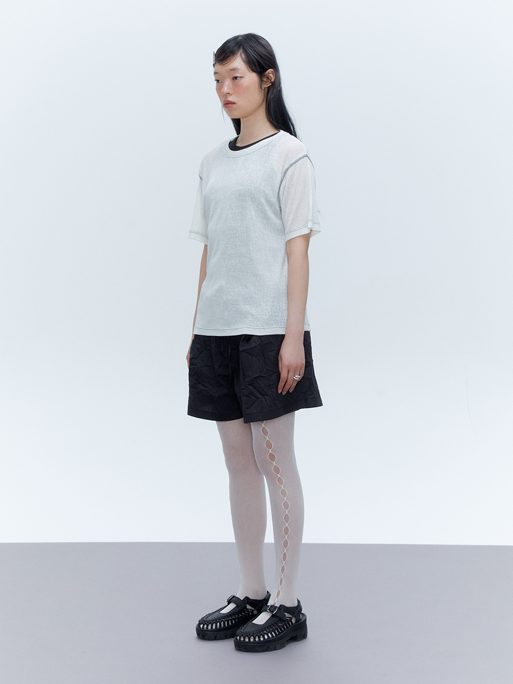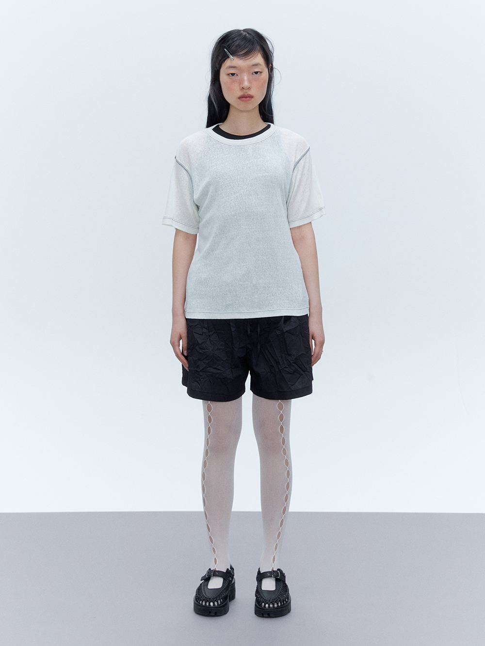 2024 SUMMER COLLECTION - COTTON, POLY 혼방의 티셔츠 - 배색 포인트 스티치 디테일 - 비침이 있는 독특한 슬럽조직의 원단 - 어깨의 늘어남 방지 및 변형을 최소화하기 위한 테잎봉제 - Made in korea +COLOR IVORY, NAVY +CARE Dry cleaning , 단독 찬물세탁 권장 +MODEL SIZE 167cm Model(Female) wears size Free