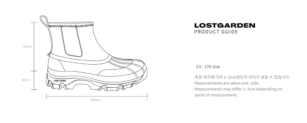 • 로스트가든 × 트레통 협업 • 덕 부츠 타입의 아웃도어 부츠를 현대적인 디자인으로 재해석한 레인부츠 • 전통적인 덕 부츠에서 볼 수 있는 토 캡의 러버 쉘 디테일 • FSC 인증 천연고무 사용 • 완벽한 방수와 빠른 건조를 위해 3M 네오프렌과 메시를 합포한 어퍼 • 내구성과 신축성이 뛰어난 3M 네오프렌 라이닝 • 트레통 로고 풀 탭과 로스트가든 로고 가죽 탭 디테일 • 안정성 강화를 위해 금속 레일이 적용된 미드솔 • 탈부착이 가능한 EVA 인솔 • 견고한 내구성과 비틀림에 강한 러버 아웃솔 상품 정보 • Upper: FSC-certified® Rubber & Neoprene & Mesh • Lining: Neoprene • Insole: EVA (1cm) • Outsole: FSC-certified® Rubber Sole (4cm) 사이즈 안내 • 평소 착용하시는 신발 정사이즈로 추천드립니다.