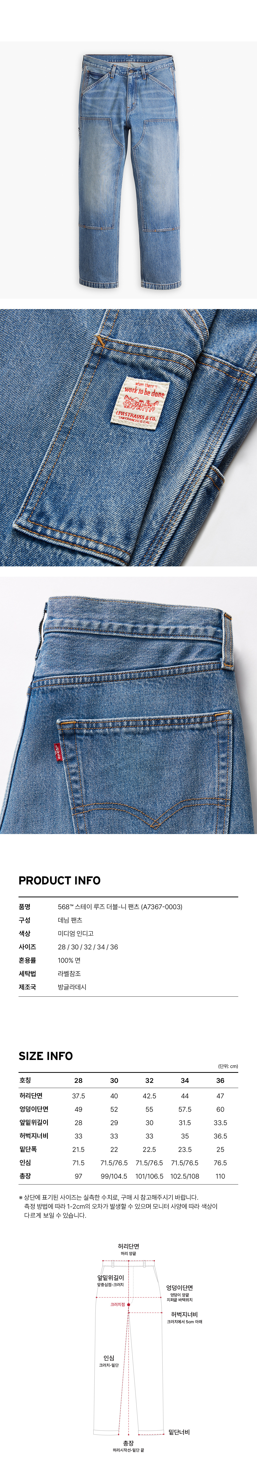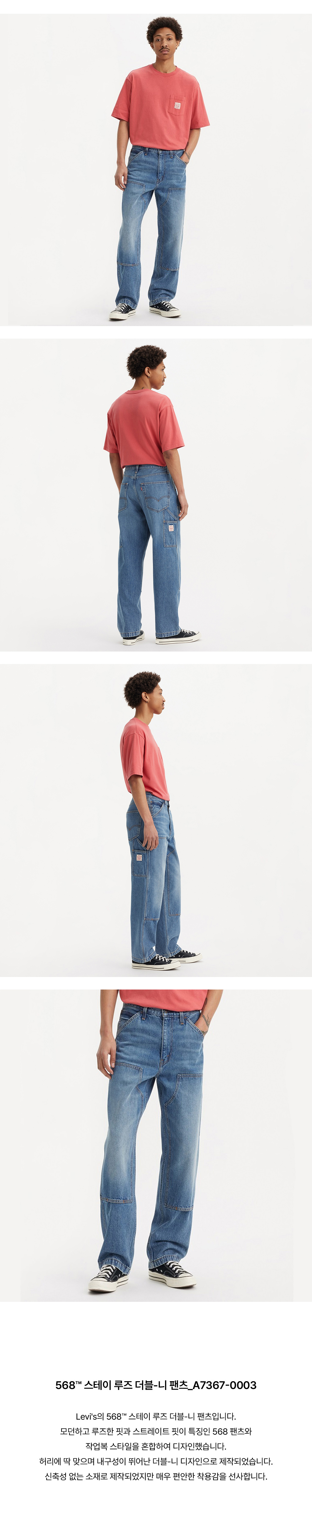 Levi's의 568™ 스테이 루즈 더블-니 팬츠입니다. 모던하고 루즈한 핏과 스트레이트 핏이 특징인 568 팬츠와 작업복 스타일을 혼합하여 디자인했습니다. 허리에 딱 맞으며 내구성이 뛰어난 더블-니 디자인으로 제작되었습니다. 신축성 없는 소재로 제작되었지만 매우 편안한 착용감을 선사합니다.
