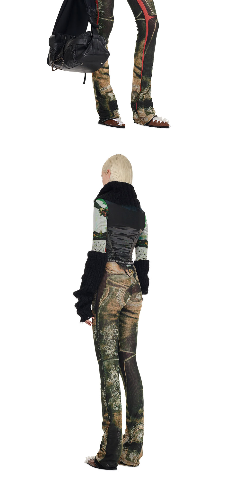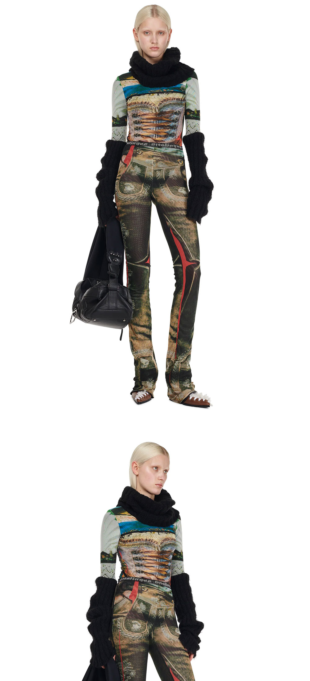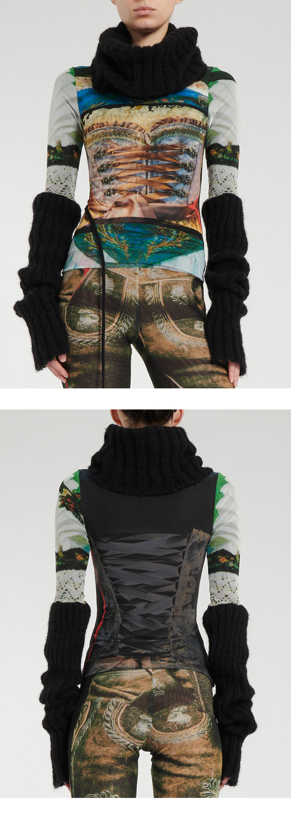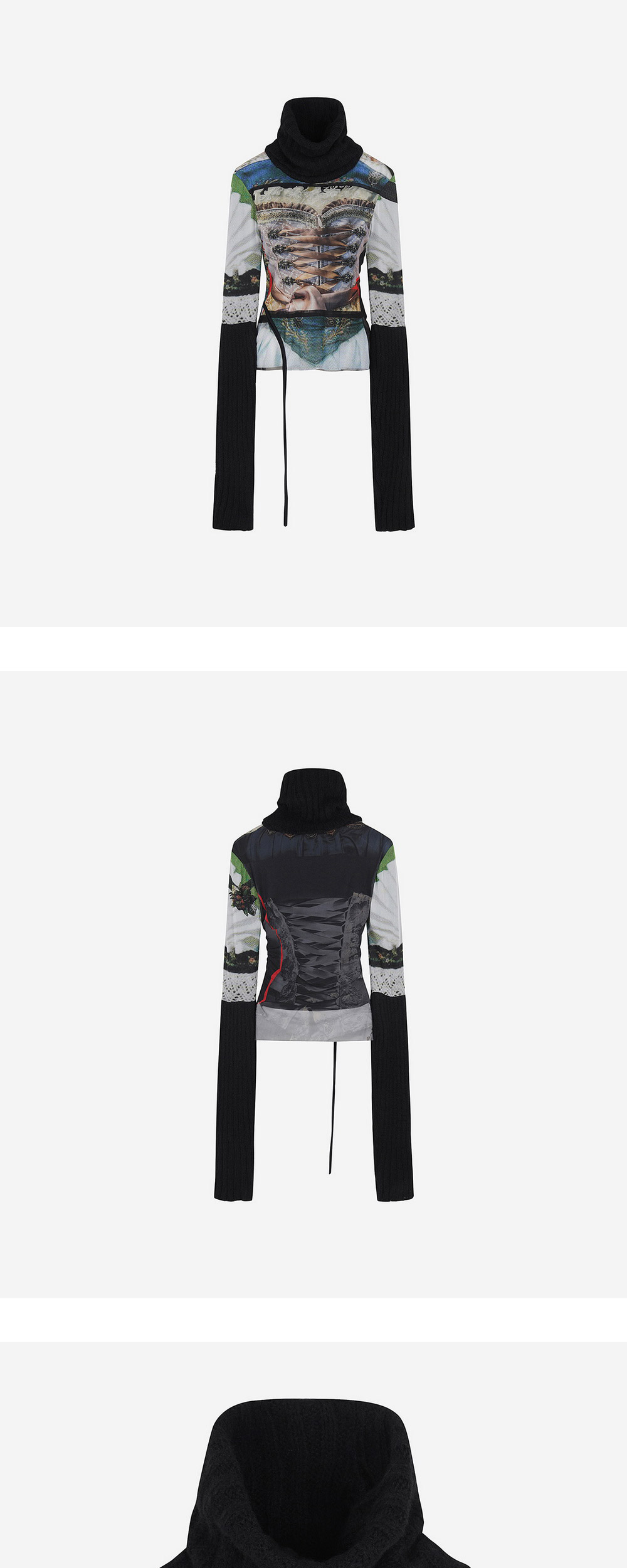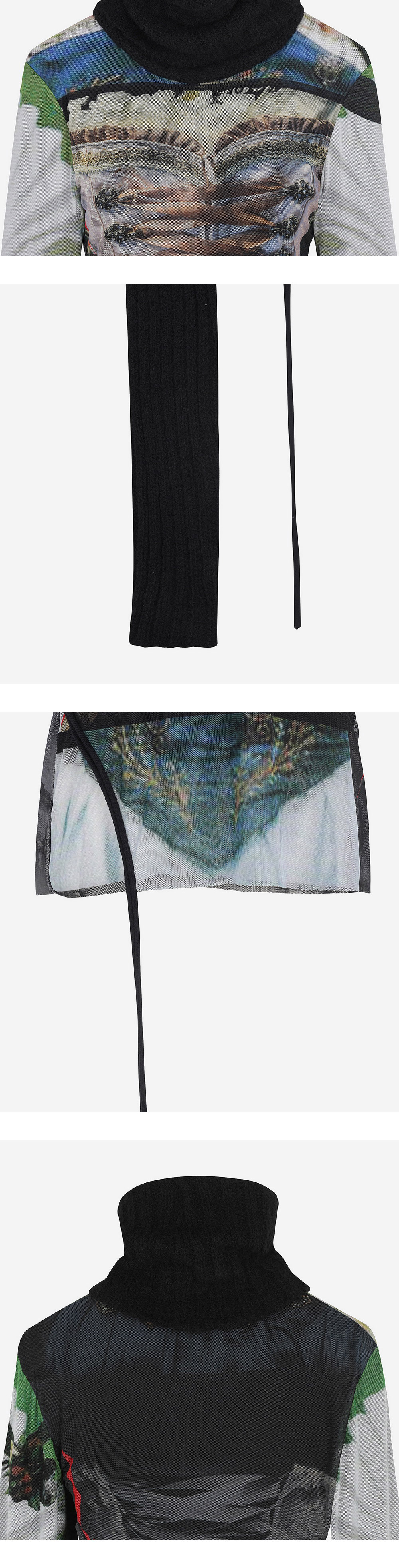 몸통의 코르셋 프린트가 특징인 오토링거의 메쉬 롱슬리브 터틀넥입니다. - 슬림핏 - 메쉬 원단 - 골지 터틀넥 & 소매 | 사이즈 가이드 | - 모델: 181m - 착용 사이즈: XS