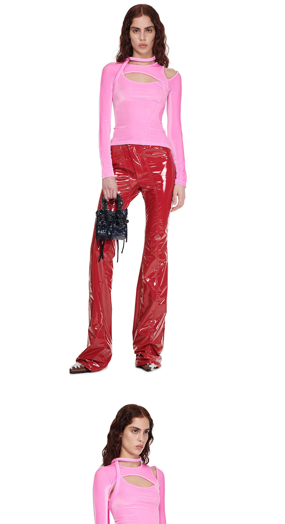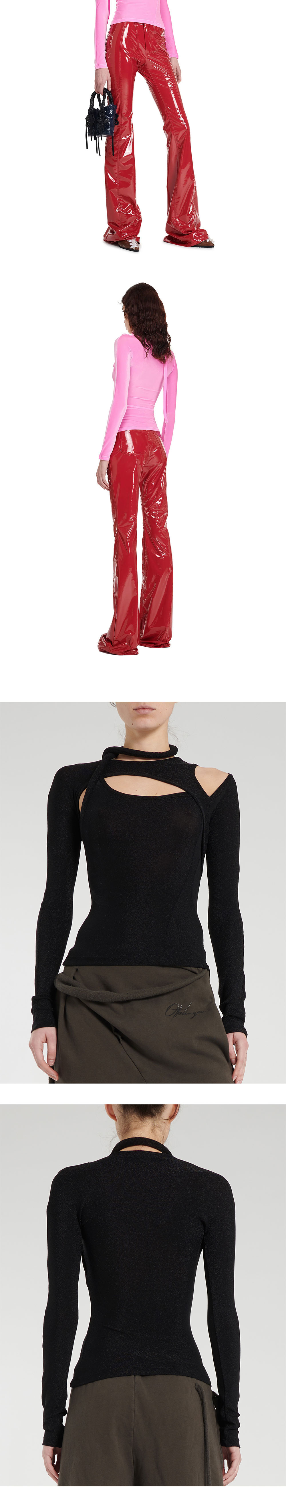 비대칭적인 컷아웃 디자인이 돋보이는 오토링거의 레이어드 컷 아웃 롱슬리브입니다. - 타이트 핏 - 스트랩 디테일 | 사이즈 가이드 | - 모델 1: 178cm - 착용 사이즈: XS - 착용 컬러: Pink - 모델 2 - 착용 컬러: Black Shine