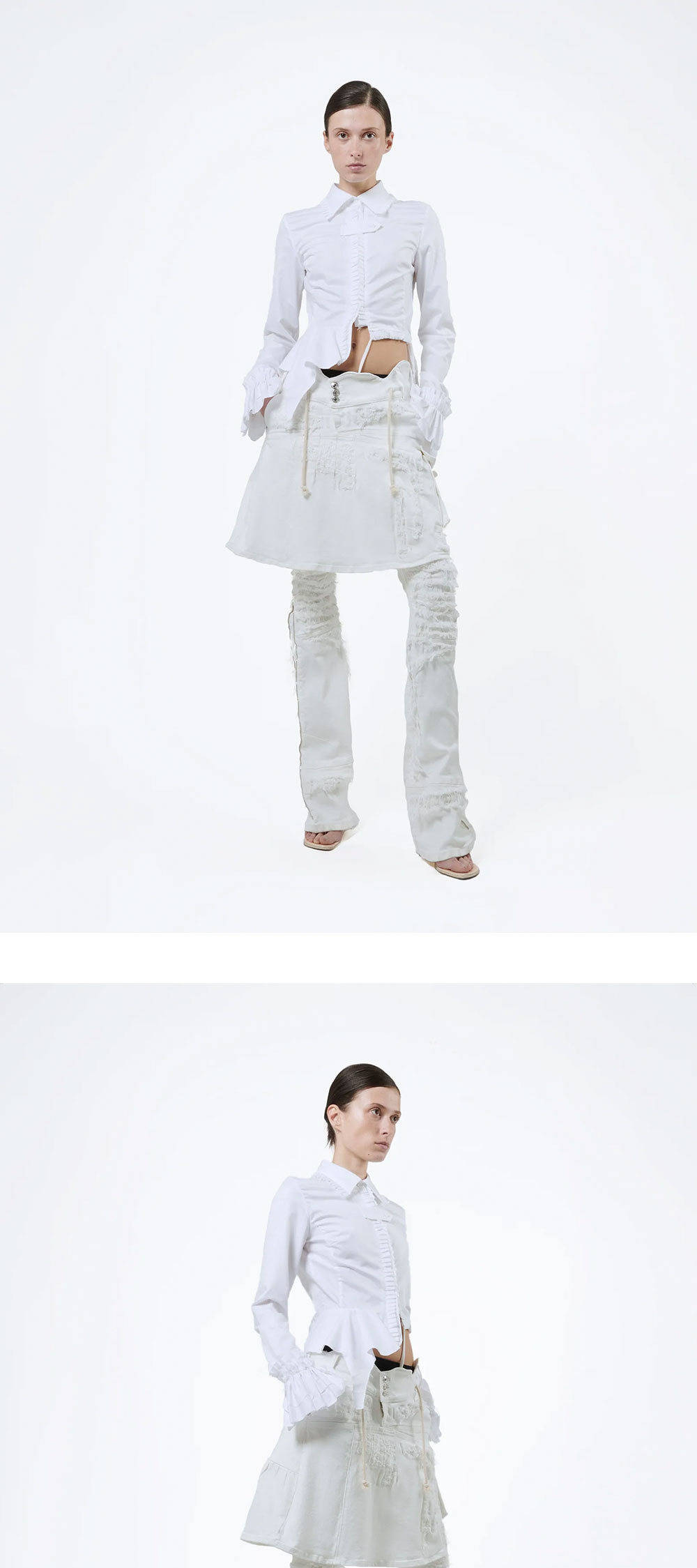 플리츠와 셔링 디테일이 돋보이는 오토링거의 러치드 롱슬리브 블라우스입니다. - 타이트핏 - 비대칭 밑단과 플레어 커프스 장식 - 디스트레스드 디테일 | 사이즈 가이드 | - 모델: 177cm - 착용 사이즈: XS - 착용 컬러: White