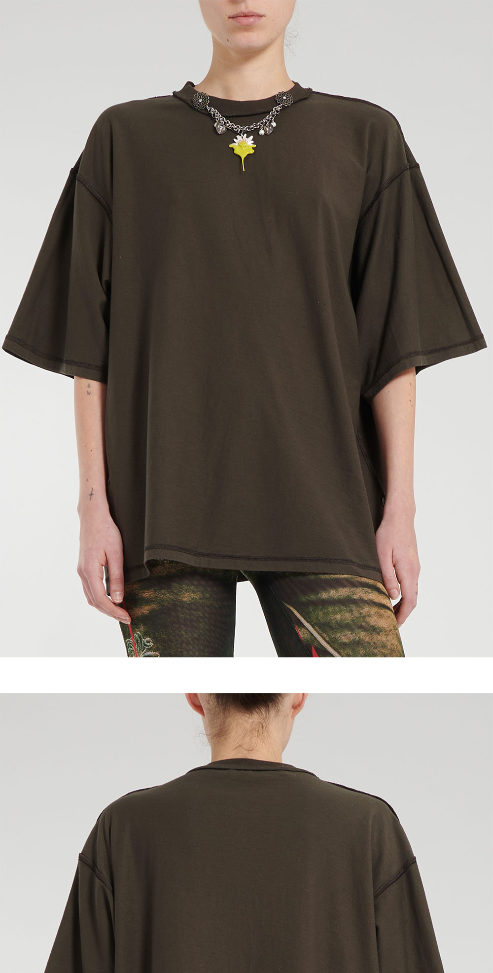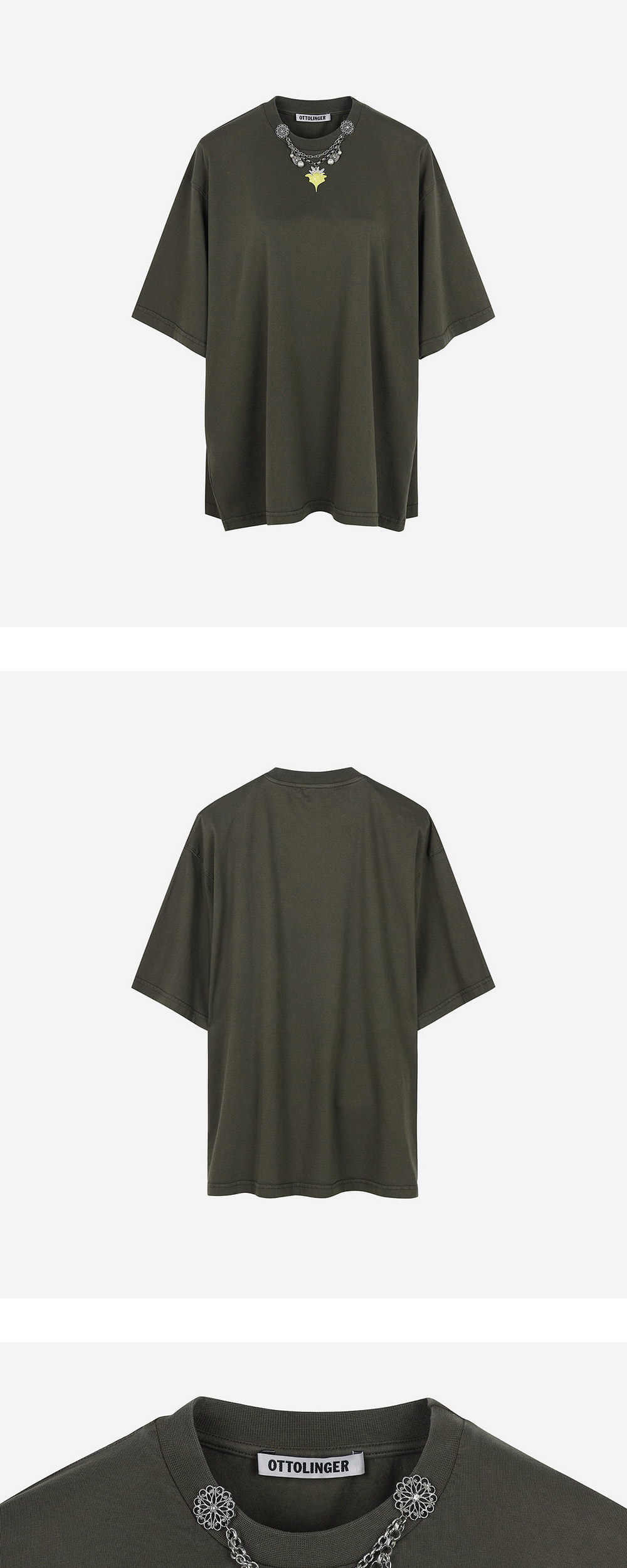 빈티지한 워싱과 펜던트 장식이 돋보이는 오토링거의 오버사이즈 참 티셔츠입니다. - 오버사이즈 핏 - 네크라인의 펜던트 디테일 * 상품마다 참 부분의 개체별 차이가 있을 수 있습니다.