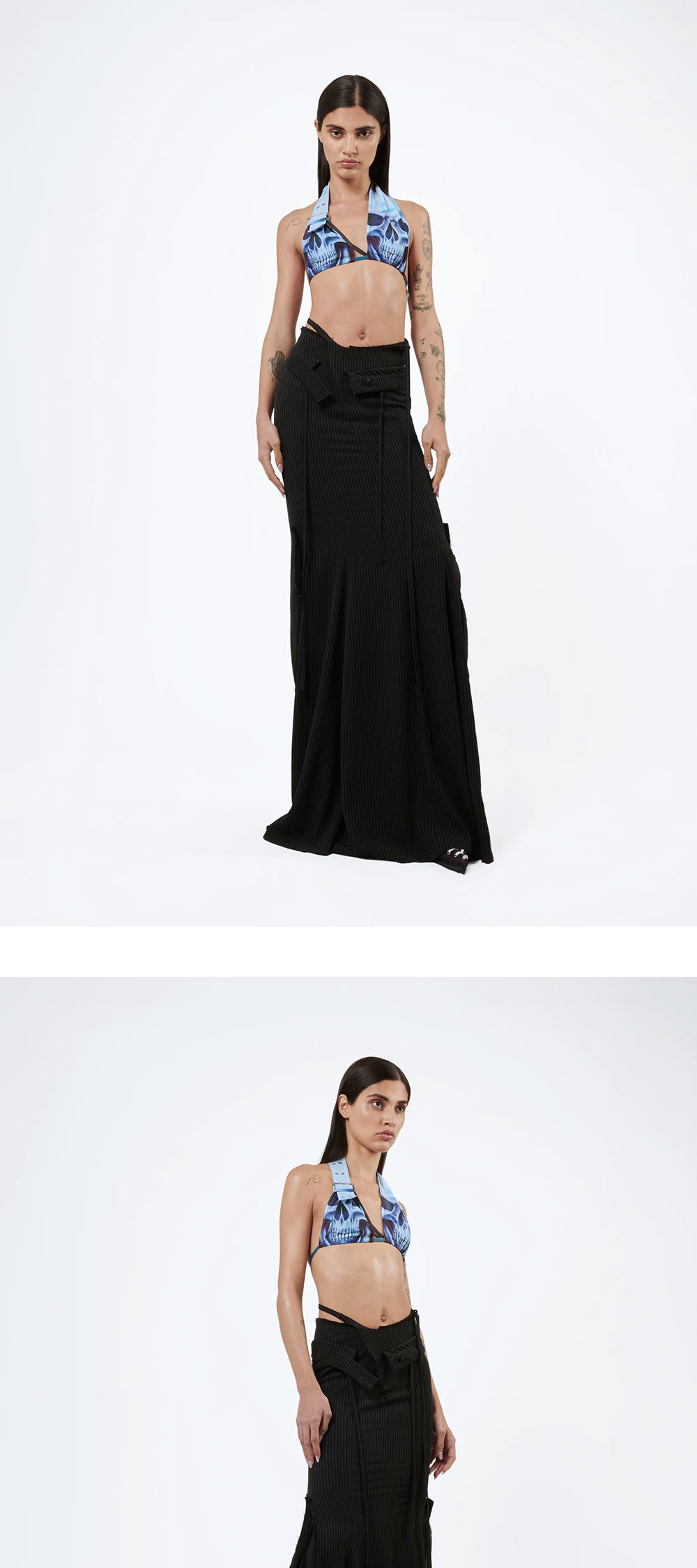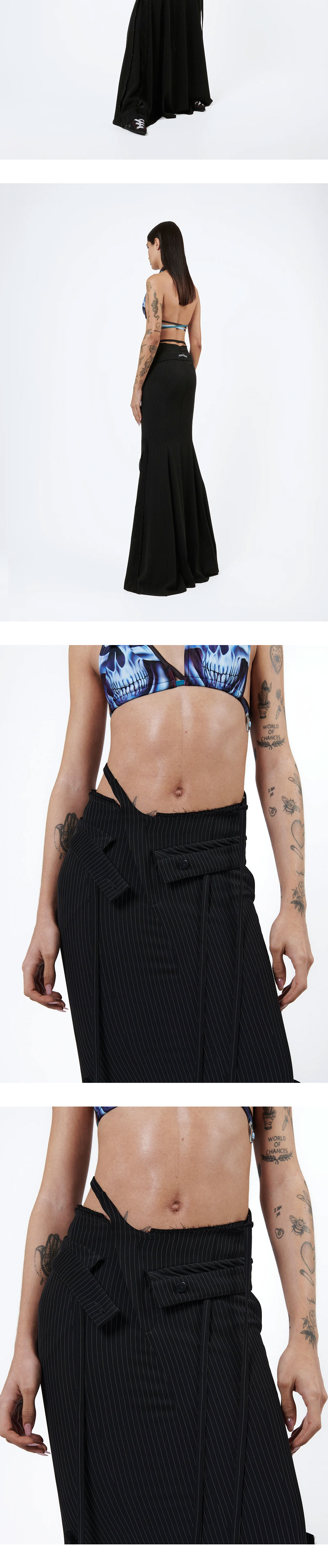 한단 접혀 오픈된 허리 밴드와 디스트레스드 디테일이 돋보이는 오토링거의 머메이드 수트 스커트입니다. - 허리 밴딩 부분의 스트랩과 디스트레스드 디테일 - 맥시한 머메이드 스타일 실루엣 | 사이즈 가이드 | - 모델 1: 178cm - 착용 사이즈: 34 - 착용 컬러: Pinstripe - 모델 2 - 착용 컬러: Black