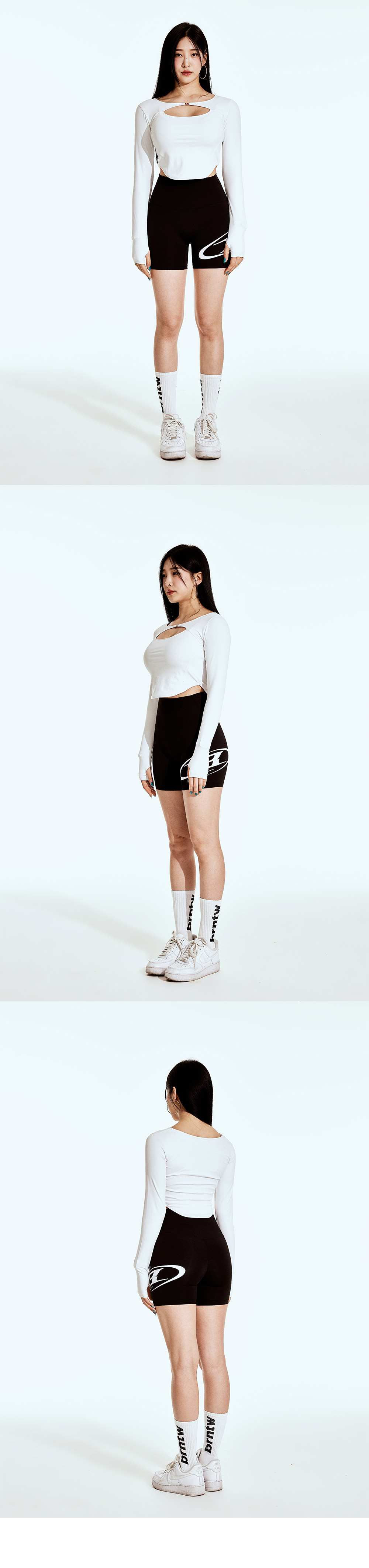 [DETAILS] * B 버클 컷아웃 롱슬리브 - 편안한 착용감의 슬림핏 - 체형을 돋보이는 크롭한 기장 Material : Polyester 80% Polyurethane 20% Fittiing : F Size, 171cm, 57kg