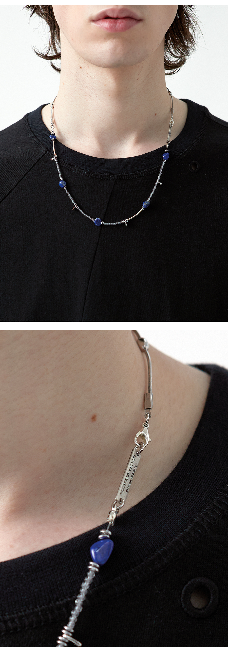 Material : Lapis Lazuli Gemstone / Surgical steel / Silver piping / Metal logo pendant Colour : Cobalt blue - Cobalt blue Lapis Lazuli stone necklace - Surgical chain - Silver piping detail - 라피스 라즐리 원석으로 제작된 비즈 네클리스