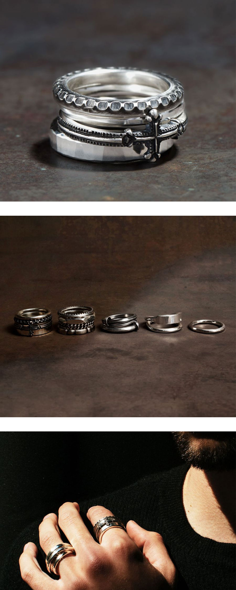 4개의 링이 크로스링을 중심으로 하나의 반지처럼 어우러지는 콤비네이션 링입니다. - 상단의 링으로 크기 결정 - 손가락의 해부학적 구조를 참고한 설계 및 구성 - 디자인 순서대로 착용했을 때 완벽한 착용감