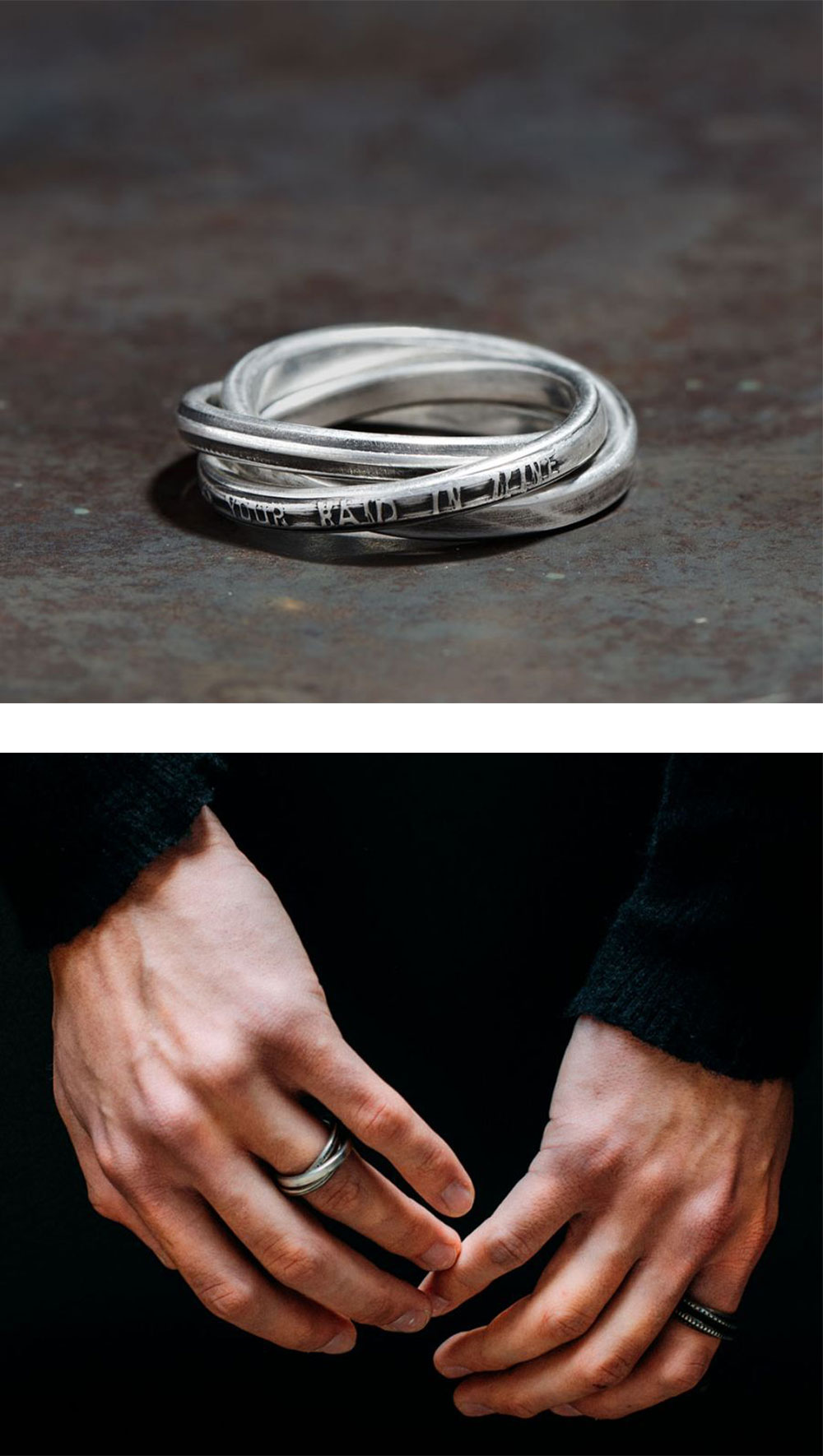 세 개의 반지가 교차된 형태에 레드 제플린의 곡 "Thank You"의 가사 일부가 새겨진 포에버 실버 반지입니다. - 개별 수작업으로 인한 각 링 고유의 텍스처 - 너비 7mm