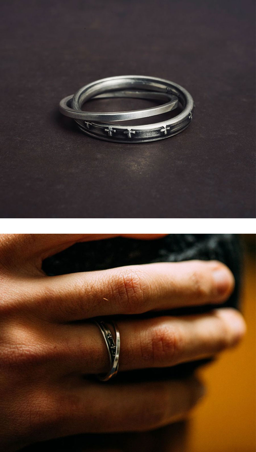 두 개의 링이 하나로 연결된 형태. 첫 번째 링은 단순한 실버 피스이지만, 두 번째 링는 + 부호가 양각된 불규칙한 패턴을 가지고 있습니다. +선은 문자 그대로의 의미에서 통일, 긍정이라는 개념을 상징합니다. 모든 링은 개별 수작업으로 제작되어 각 링의 표면은 고유의 디자인을 갖습니다.