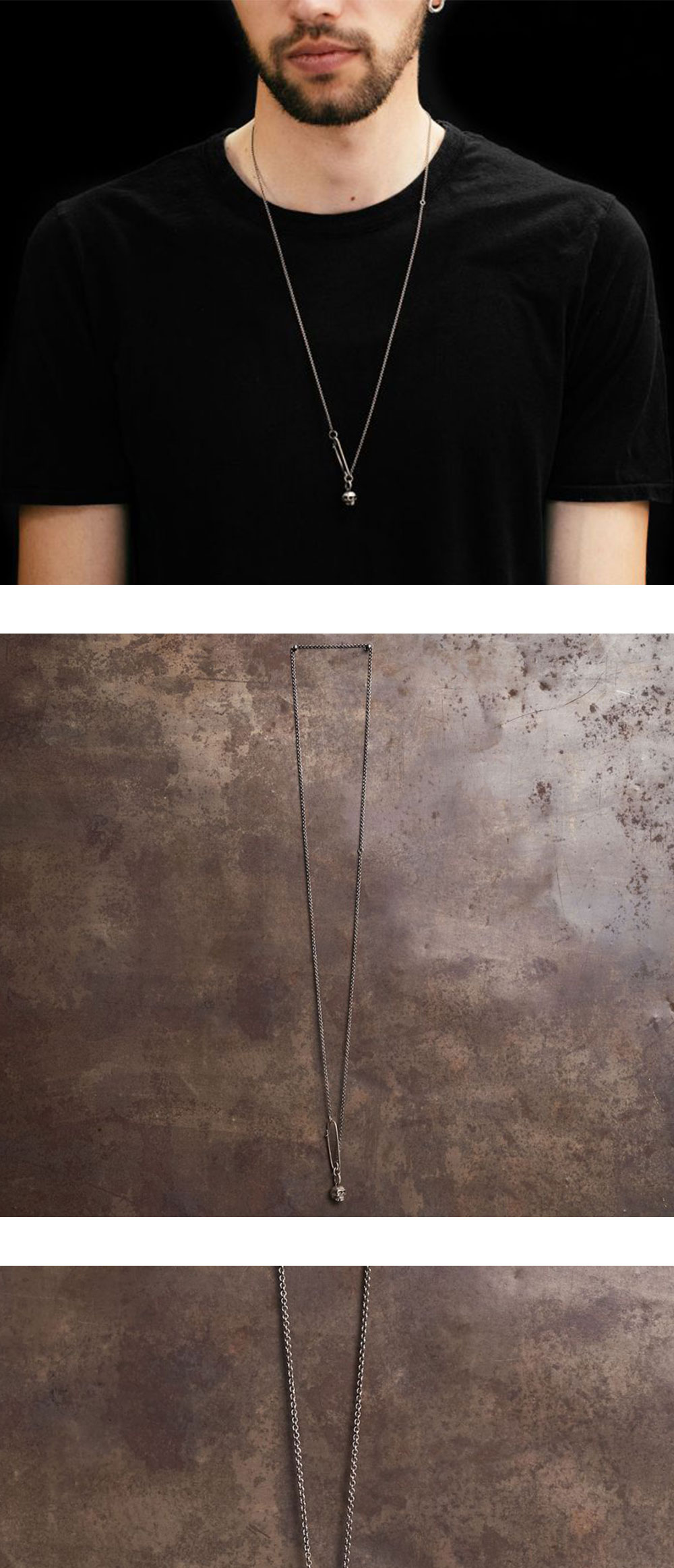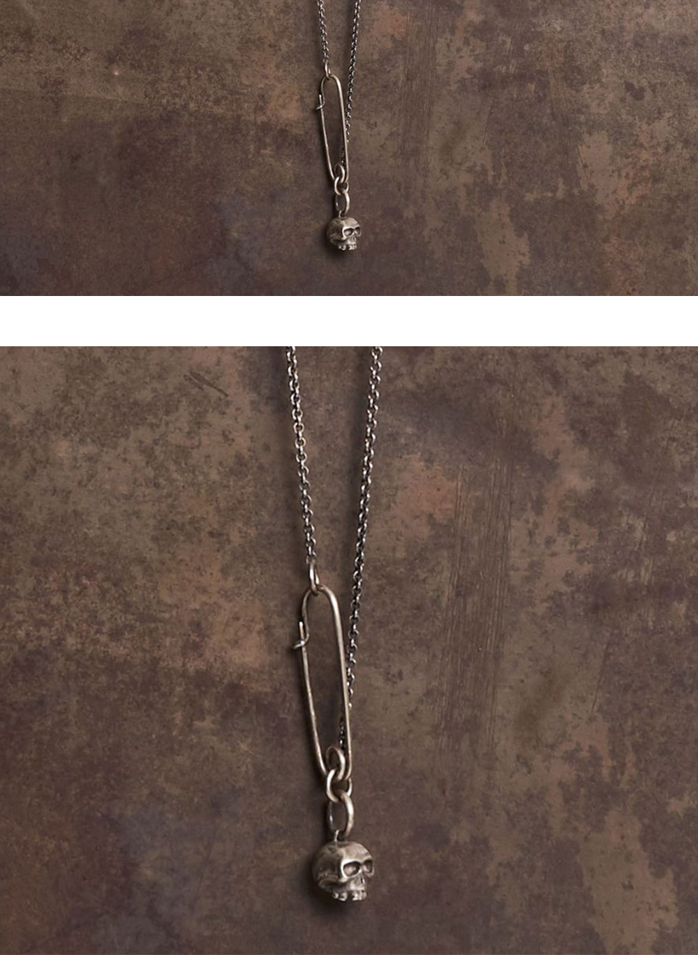 해골 조형물 참이 달린 체인 네크리스입니다. - 펑크 락 스타일을 반영한 핸드메이드 안전핀 잠금장치 | 사이즈 가이드 | - 총장: 72cm
