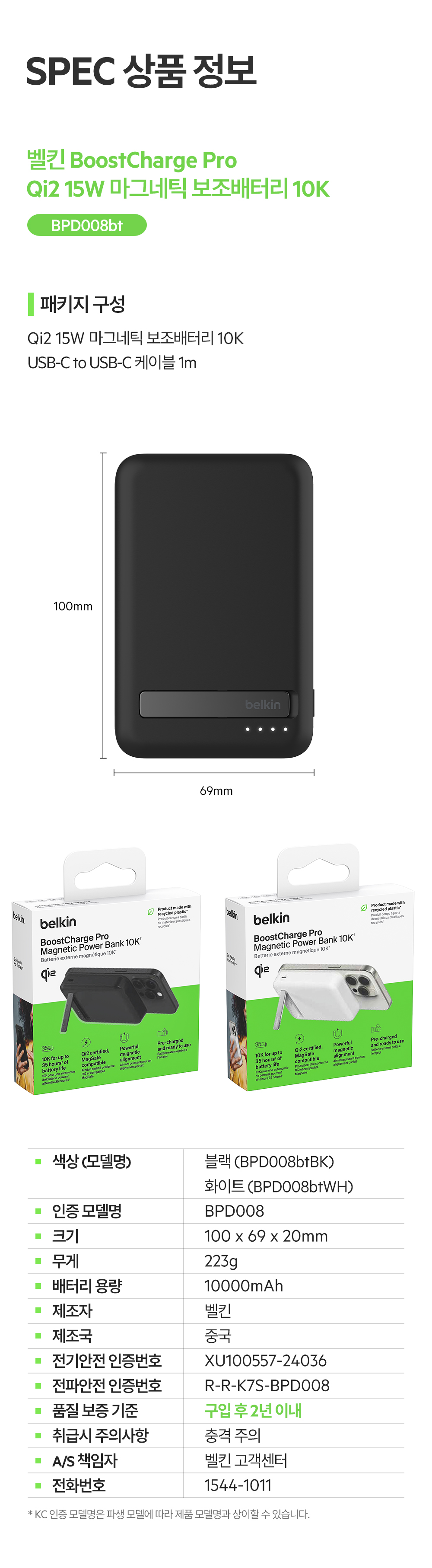 벨킨 10000mAh Qi2 15W 마그네틱 무선 충전 보조배터리 BPD008bt 블랙