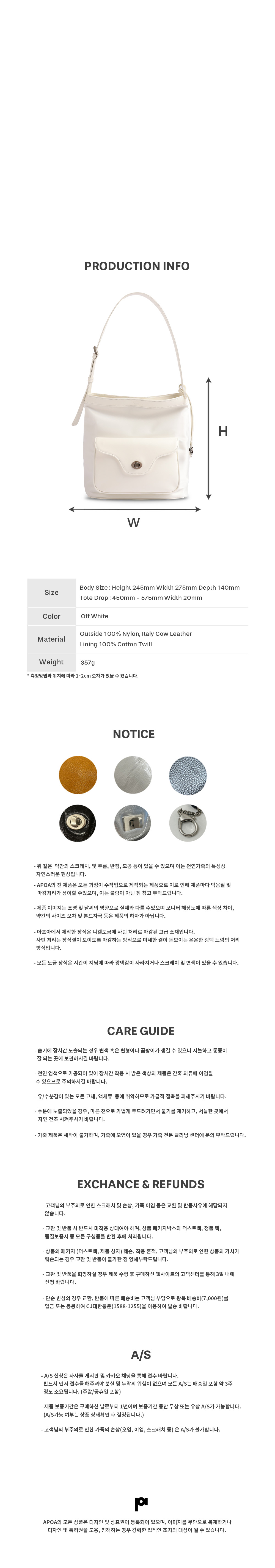 Suave bucket bag은 이태리 소가죽과 나일론 콤비로 제작된 가방입니다. 정면 중앙 포켓과 중앙 바디로 제작되었으며, 버킷백의 형태로 데일리하면서도 유니크한 디자인의 가방입니다. 이태리 카우레더와 코팅이된 나일론 원단을 활용하여 부드러운 터치감과 은은한 텍스처감을 느낄 수 있습니다. 또한 중앙 바디의 폭을 넉넉하게 주어 수납의 용이성을 더하였습니다.