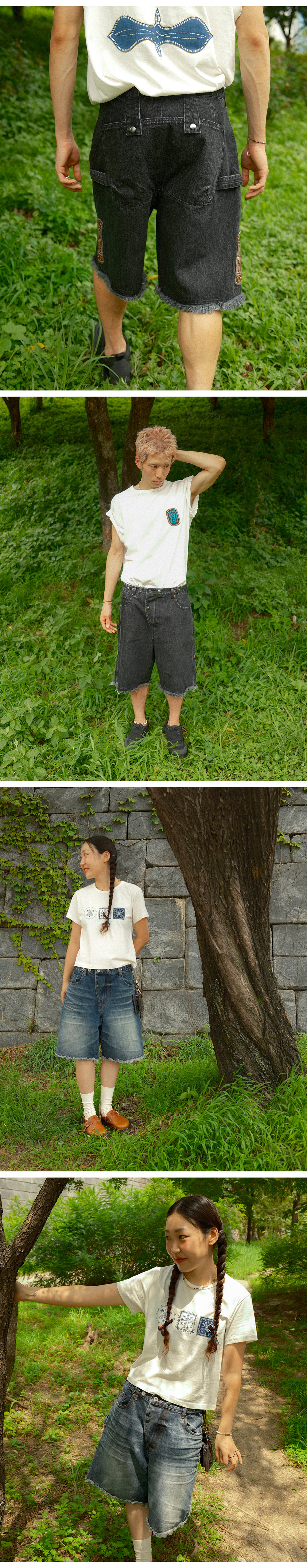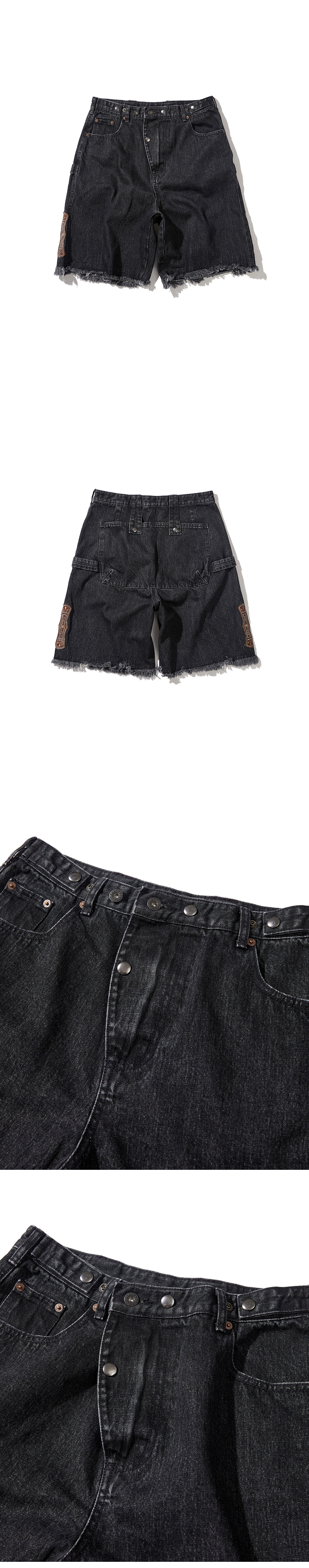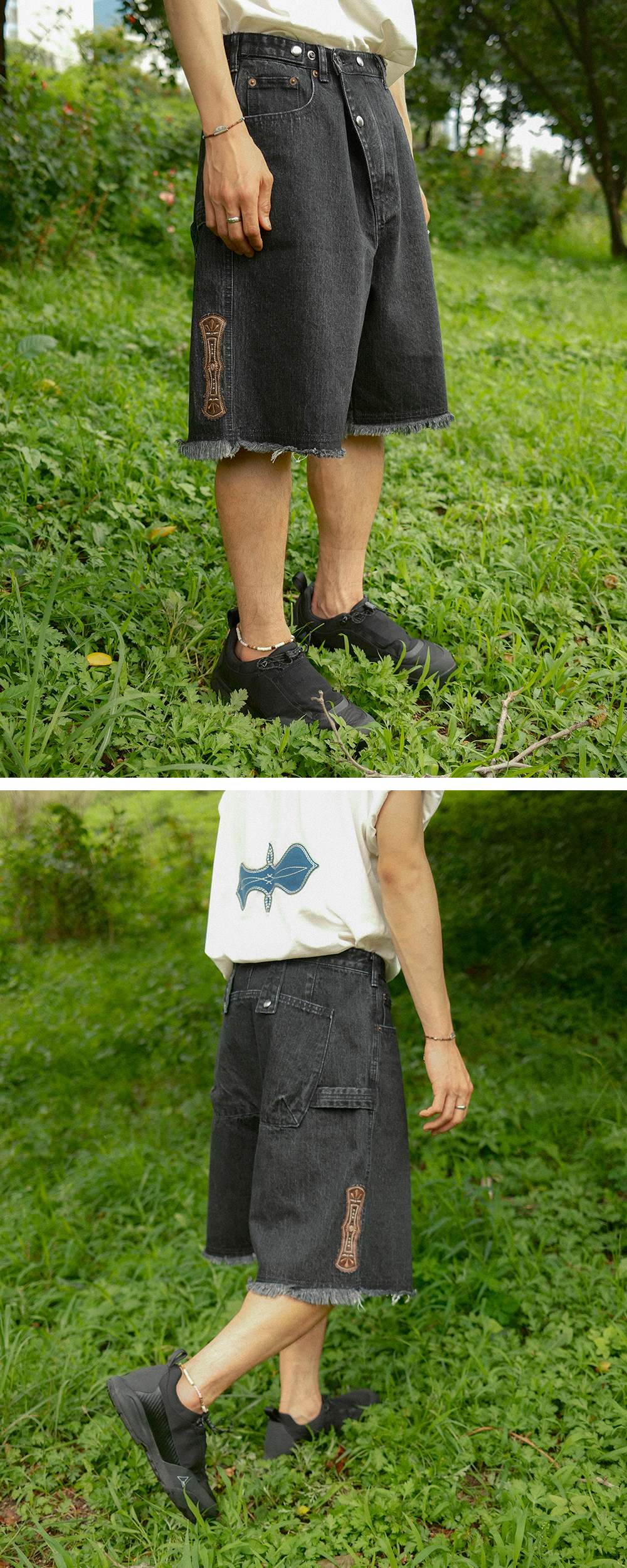 Product Info. - 13.5oz 밀도 높은 두께감과 겉면 러프한 슬라브 텍스처의 고품질 데님 원단 - 여유 있는 와이드 실루엣의 버뮤다 데님 팬츠 - 복합 워싱 가공으로 빈티지한 원단감 구현 - 감각적인 형태감과 허리 사이즈 조절 기능의 전면 여밈 부 디자인 - 후면 구조적인 형태의 입체 포켓 디자인 - 후면 포켓 양쪽 해머 루프 디테일 - 후면 양 사이드 레더 패치드 자수 포인트 - 빈티지 무드의 밑단 컷 오프 디테일 - 허리 사이즈 조절 가능한 양 사이드 어드저스터 디테일 - YKK 지퍼, YKK 택버튼, YKK 스냅, YKK 리벳 사용