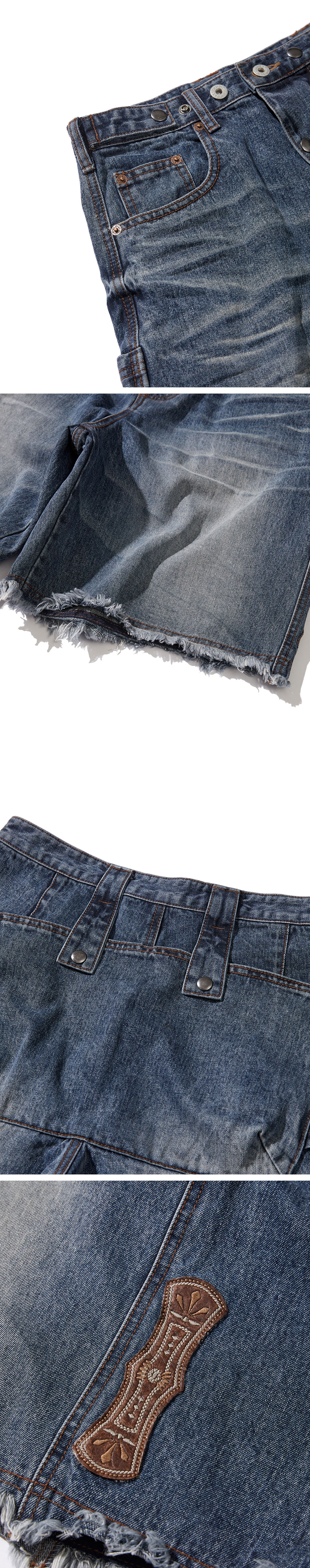 Product Info. - 13.5oz 밀도 높은 두께감과 겉면 러프한 슬라브 텍스처의 고품질 데님 원단 - 여유 있는 와이드 실루엣의 버뮤다 데님 팬츠 - 복합 워싱 가공으로 빈티지한 원단감 구현 - 감각적인 형태감과 허리 사이즈 조절 기능의 전면 여밈 부 디자인 - 후면 구조적인 형태의 입체 포켓 디자인 - 후면 포켓 양쪽 해머 루프 디테일 - 후면 양 사이드 레더 패치드 자수 포인트 - 빈티지 무드의 밑단 컷 오프 디테일 - 허리 사이즈 조절 가능한 양 사이드 어드저스터 디테일 - YKK 지퍼, YKK 택버튼, YKK 스냅, YKK 리벳 사용