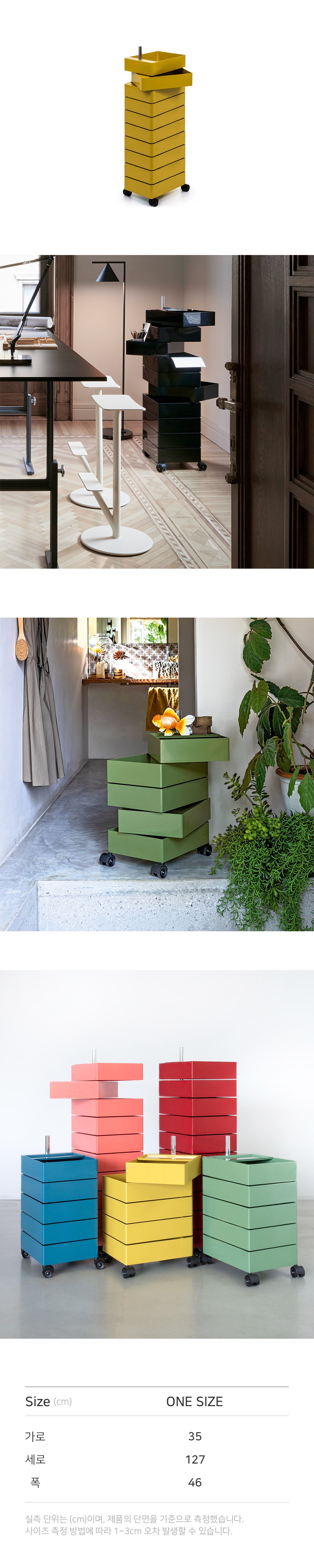 메탈 금속봉을 중심으로 모든 서랍장이 360° 회전이 가능하게 설계된 수납장입니다. 손으로 당기기만 하면 간단하게 내용물을 꺼내 사용할 수 있으며, 각종 소품, 서류함, 종류별로 분류 해야하는 약 등을 구비하기에 좋습니다. 5개의 서랍과 10개의 서랍 2가지 사이즈로 출시되어 용도에 따라 높이를 선택할 수 있습니다. [Notice] ㆍ한 칸당 하중 3kg으로 많은 물건 넣으실 경우 한쪽으로 쳐질 수 있습니다. ㆍ제품의 설계 구조상 서랍의 단차가 일정하지 않을 수 있습니다. ㆍ플라스틱 제품 소재 및 생산 공정 특성상 미세 스크래치, 사출자국 등이 있을 수 있습니다.