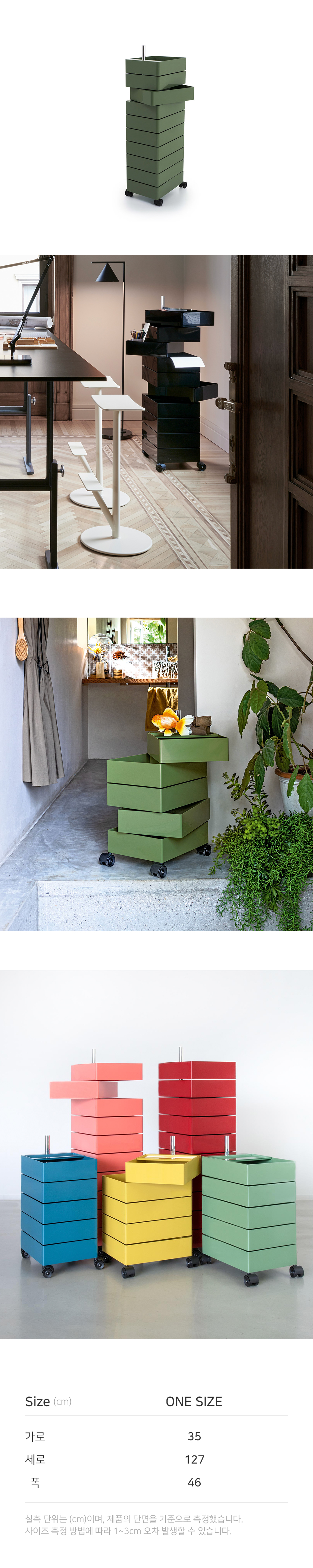 메탈 금속봉을 중심으로 모든 서랍장이 360° 회전이 가능하게 설계된 수납장입니다. 손으로 당기기만 하면 간단하게 내용물을 꺼내 사용할 수 있으며, 각종 소품, 서류함, 종류별로 분류 해야하는 약 등을 구비하기에 좋습니다. 5개의 서랍과 10개의 서랍 2가지 사이즈로 출시되어 용도에 따라 높이를 선택할 수 있습니다. [Notice] ㆍ한 칸당 하중 3kg으로 많은 물건 넣으실 경우 한쪽으로 쳐질 수 있습니다. ㆍ제품의 설계 구조상 서랍의 단차가 일정하지 않을 수 있습니다. ㆍ플라스틱 제품 소재 및 생산 공정 특성상 미세 스크래치, 사출자국 등이 있을 수 있습니다.