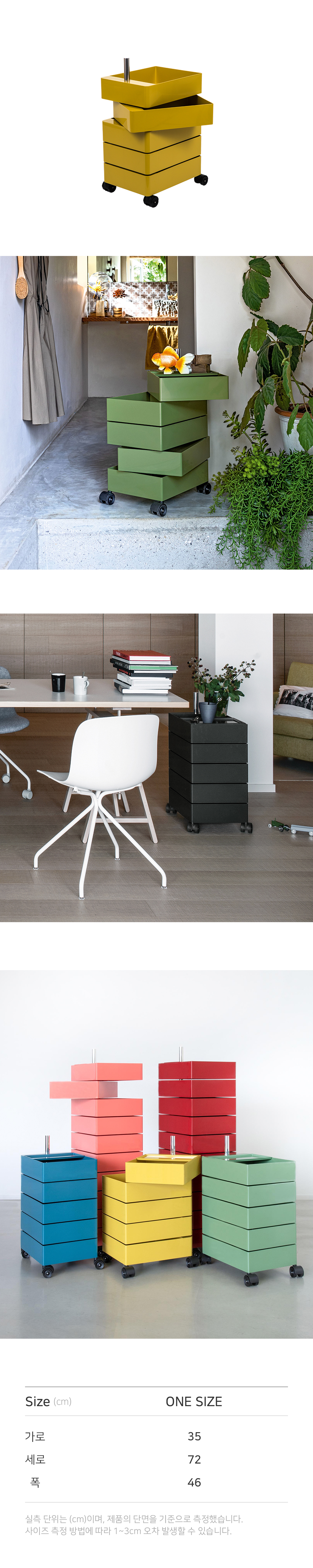 메탈 금속봉을 중심으로 모든 서랍장이 360° 회전이 가능하게 설계된 수납장입니다. 손으로 당기기만 하면 간단하게 내용물을 꺼내 사용할 수 있으며, 각종 소품, 서류함, 종류별로 분류 해야하는 약 등을 구비하기에 좋습니다. 5개의 서랍과 10개의 서랍 2가지 사이즈로 출시되어 용도에 따라 높이를 선택할 수 있습니다. [Notice] ㆍ한 칸당 하중 3kg으로 많은 물건 넣으실 경우 한쪽으로 쳐질 수 있습니다. ㆍ제품의 설계 구조상 서랍의 단차가 일정하지 않을 수 있습니다. ㆍ플라스틱 제품 소재 및 생산 공정 특성상 미세 스크래치, 사출자국 등이 있을 수 있습니다.