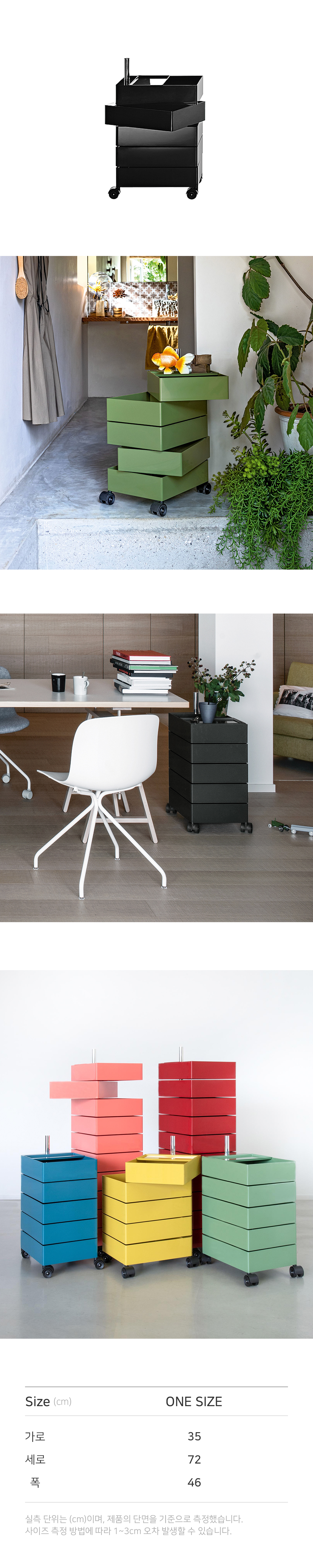 메탈 금속봉을 중심으로 모든 서랍장이 360° 회전이 가능하게 설계된 수납장입니다. 손으로 당기기만 하면 간단하게 내용물을 꺼내 사용할 수 있으며, 각종 소품, 서류함, 종류별로 분류 해야하는 약 등을 구비하기에 좋습니다. 5개의 서랍과 10개의 서랍 2가지 사이즈로 출시되어 용도에 따라 높이를 선택할 수 있습니다. [Notice] ㆍ한 칸당 하중 3kg으로 많은 물건 넣으실 경우 한쪽으로 쳐질 수 있습니다. ㆍ제품의 설계 구조상 서랍의 단차가 일정하지 않을 수 있습니다. ㆍ플라스틱 제품 소재 및 생산 공정 특성상 미세 스크래치, 사출자국 등이 있을 수 있습니다.