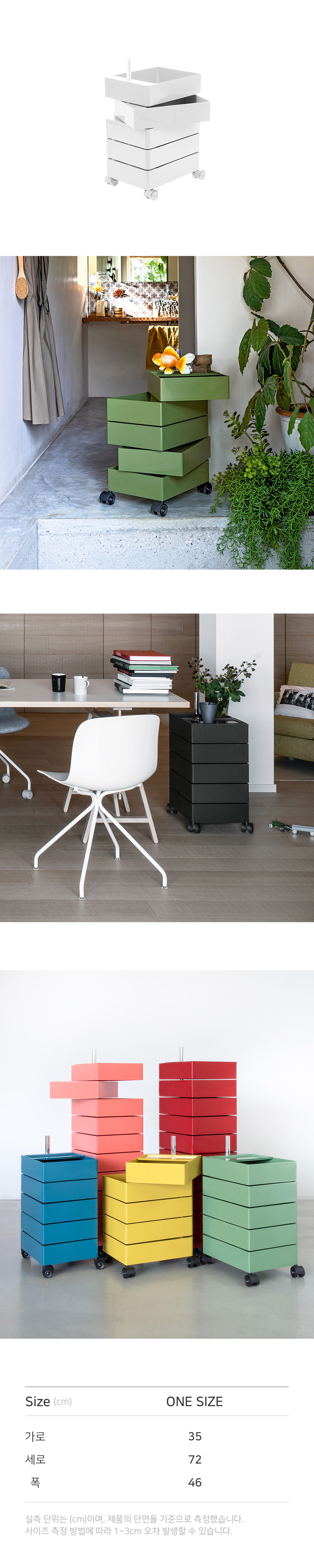 메탈 금속봉을 중심으로 모든 서랍장이 360° 회전이 가능하게 설계된 수납장입니다. 손으로 당기기만 하면 간단하게 내용물을 꺼내 사용할 수 있으며, 각종 소품, 서류함, 종류별로 분류 해야하는 약 등을 구비하기에 좋습니다. 5개의 서랍과 10개의 서랍 2가지 사이즈로 출시되어 용도에 따라 높이를 선택할 수 있습니다. [Notice] ㆍ한 칸당 하중 3kg으로 많은 물건 넣으실 경우 한쪽으로 쳐질 수 있습니다. ㆍ제품의 설계 구조상 서랍의 단차가 일정하지 않을 수 있습니다. ㆍ플라스틱 제품 소재 및 생산 공정 특성상 미세 스크래치, 사출자국 등이 있을 수 있습니다.