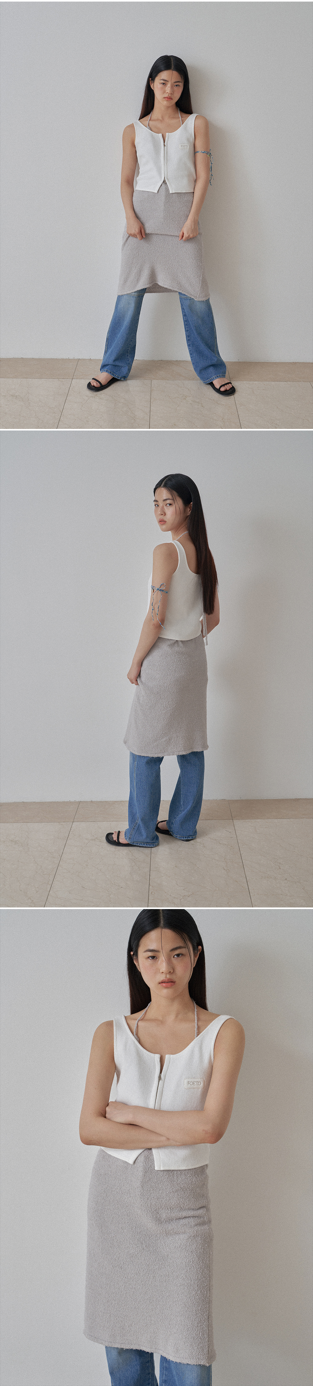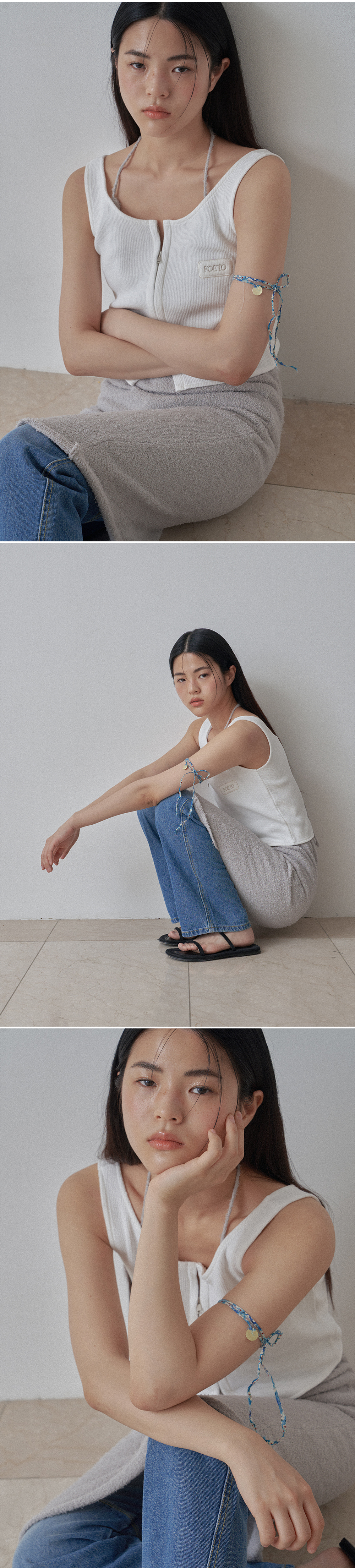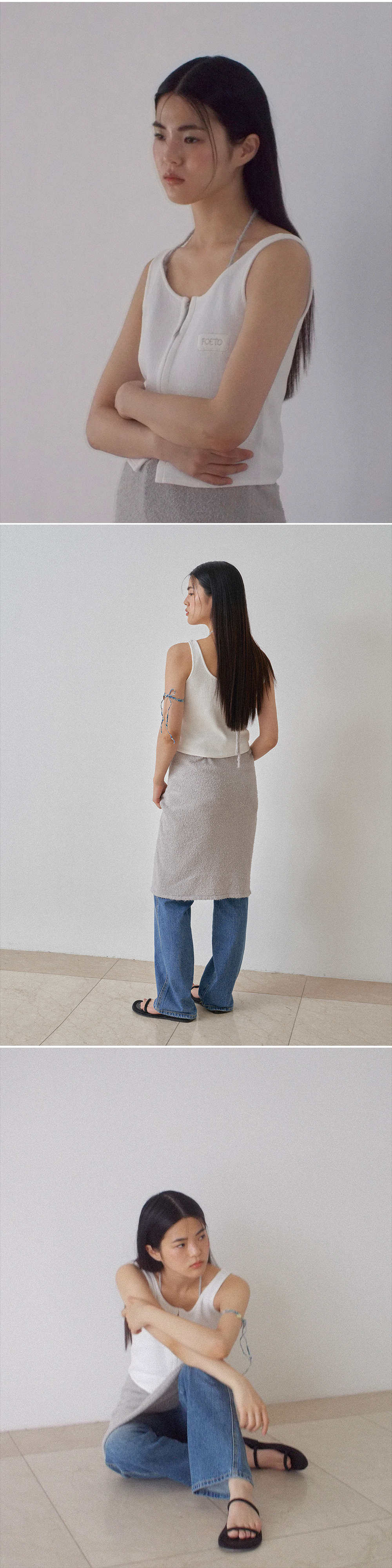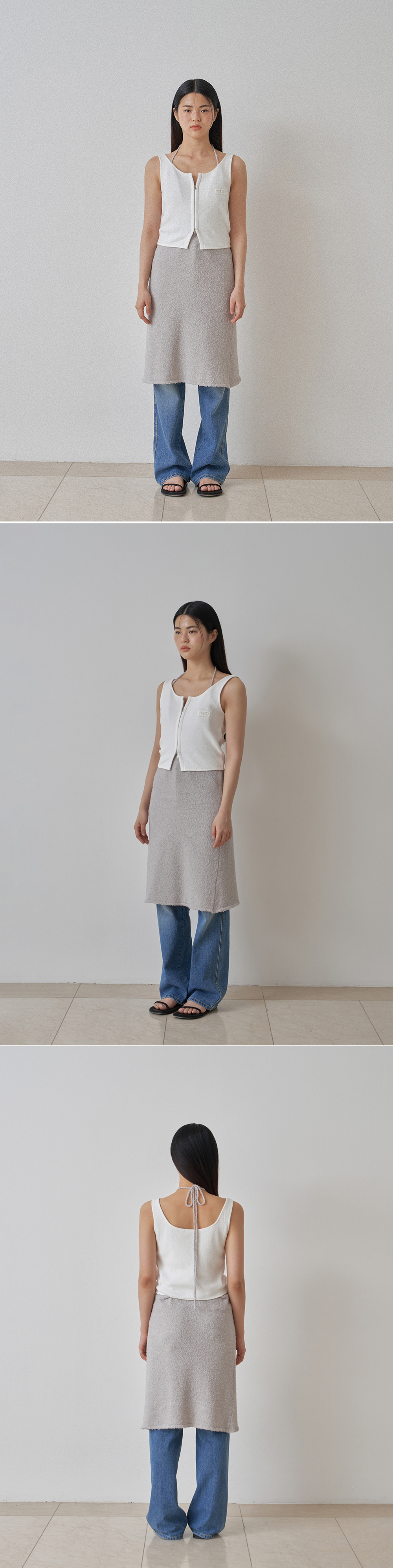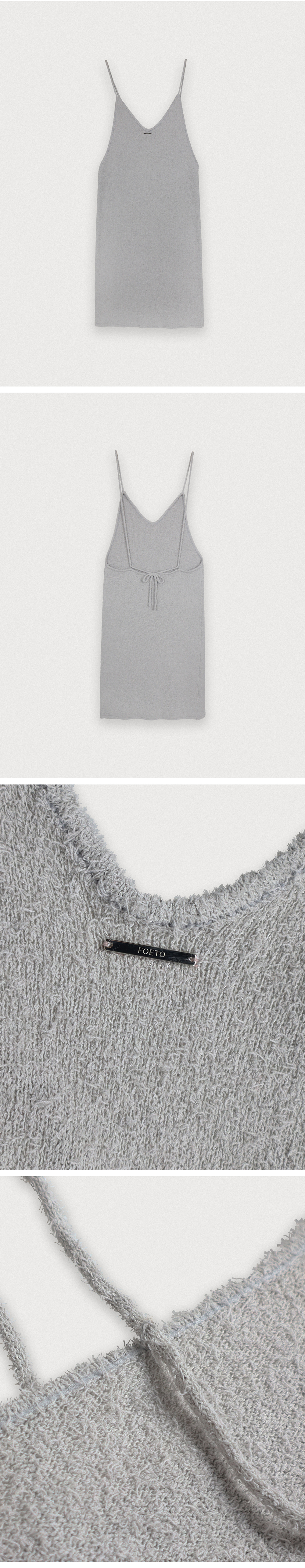 두 가지 타입으로 즐기실 수 있는 슬리브리스 타입의 원피스를 소개합니다. 긴 헤어가 곳곳에 포인트로 들어간 원사를 사용하여 원사 특유만의 시원하고 쿨한 감성이 느껴집니다. 편안한 스판감 그리고 가볍고 시원한 소재로 써머 시즌에 적합니다. 앞면은 다소 깊은 브이넥 디자인으로 잡아주어 홀터넥으로도 일반 브이넥 디자인으로 착용하실 수 있습니다. 가느다란 타이 끈 디테일로 다양하게 묶어 연출하기 좋습니다. 여행지에서의 단독 착용, 탱크톱 혹은 슬리브리스 이너 티셔츠와 함께 다양한 레이어링을 즐기실 수 있습니다. 백리스 디자인으로 가볍게 끈을 목라인에 묶어 착용하시거나, 백 라인에 작은 고리에 끈을 통과시켜 취향에 맞추어 다양하게 연출하실 수 있습니다. 포에토의 뉴 시즌 자개 펜던트를 중앙에 달아주어 소장 가치를 높였습니다.