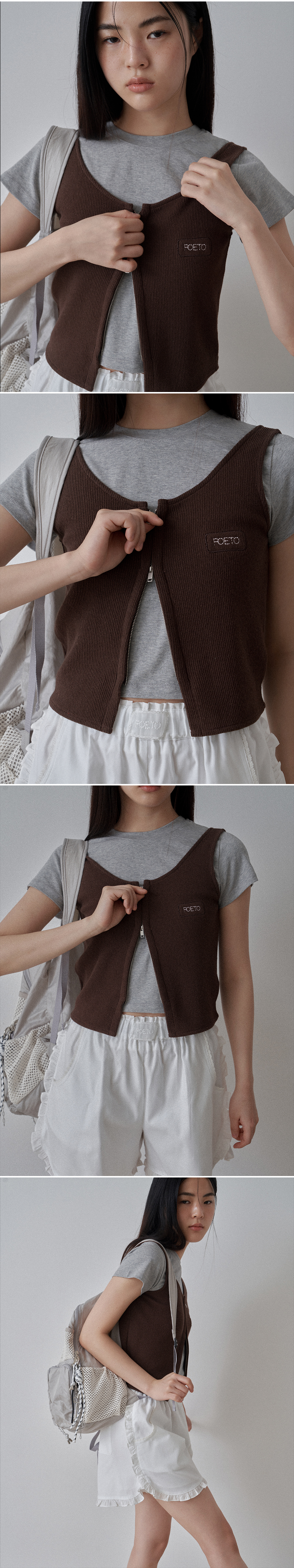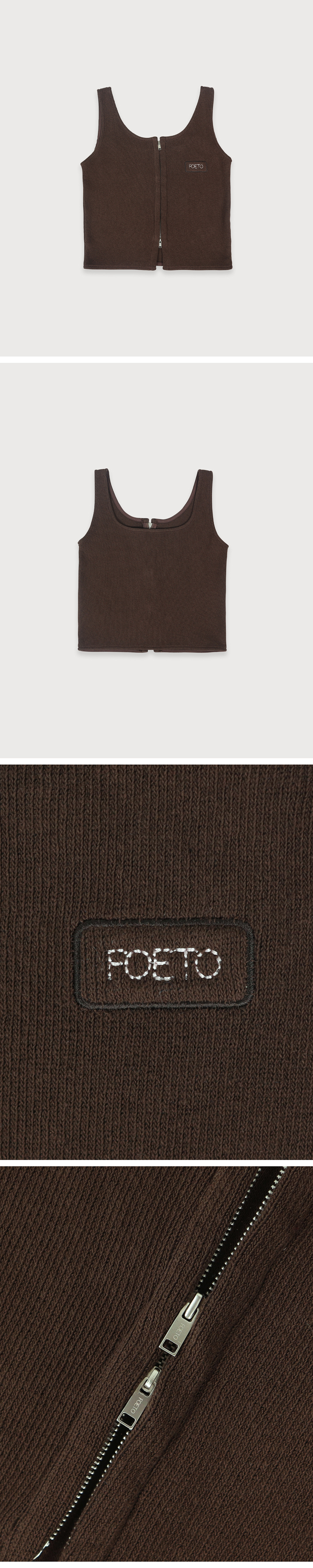 부드러운 니트같은 느낌을 주는 다이마루 소재인 니팅지로 제작된 슬리브리스 집업 아이템 입니다. 시원한 파임의 디자인과 커버에 적합한 암홀라인 그리고 슬림핏으로 떨어지는 깔끔한 크롭함 그리고 투웨이 타입의 지퍼로 다양한 스타일링이 가능합니다. 지퍼에 각인된 레이저 로고 디테일 그리고 바스트라인에는 패치 타입의 포에토 핸들 자수로 포인트를 주었습니다. 클래식함과 빈티지함이 공존하는 디자인으로 취향에 맞추어 즐겨주세요 !