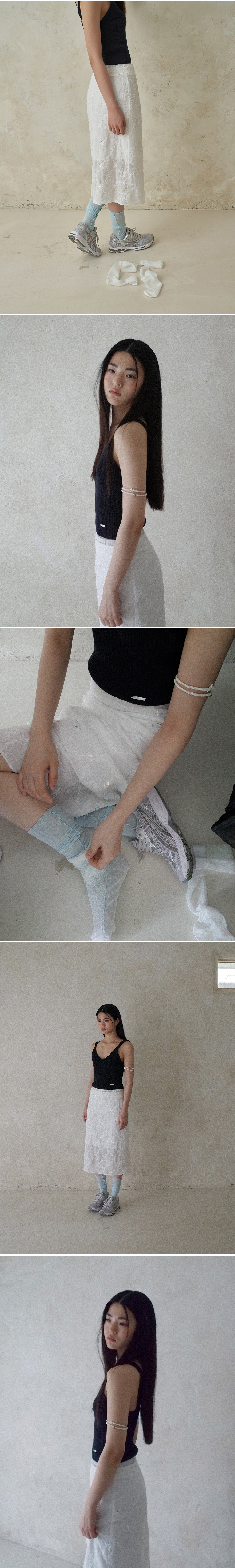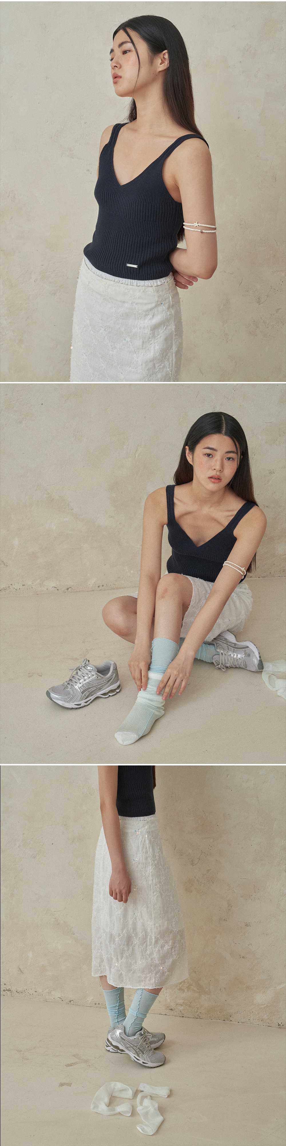살에 닿는 터칭감이 시원한 여름용 코튼소재로 제작된 니팅 슬리브리스 입니다. 이 슬리브리스 탑의 포인트는 숄더 끈으로 양갈래 머리를 땋은듯한 느낌을 주기 위해 숄더 끈을 트위스트로 생산하였고 바디라인은 불규칙한 골지 짜임들로 니팅 포인트를 더했습니다. 쫀쫀한 스판감 덕분에 편안하면서도 핏을 잘 잡아주며 크롭한 기장감 덕분에 단독은 물론 다양한 이너 아이템들과 매치에도 좋습니다