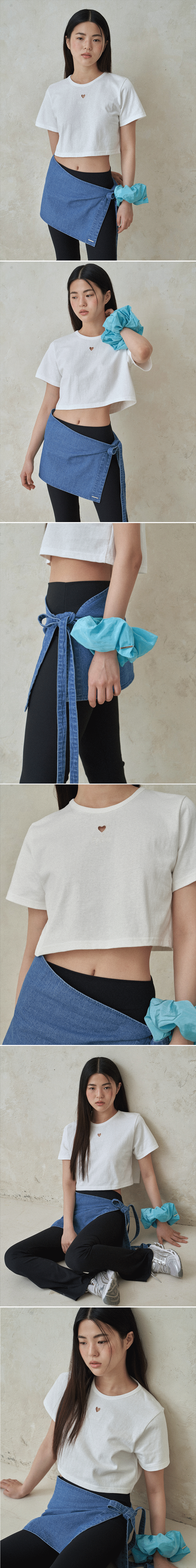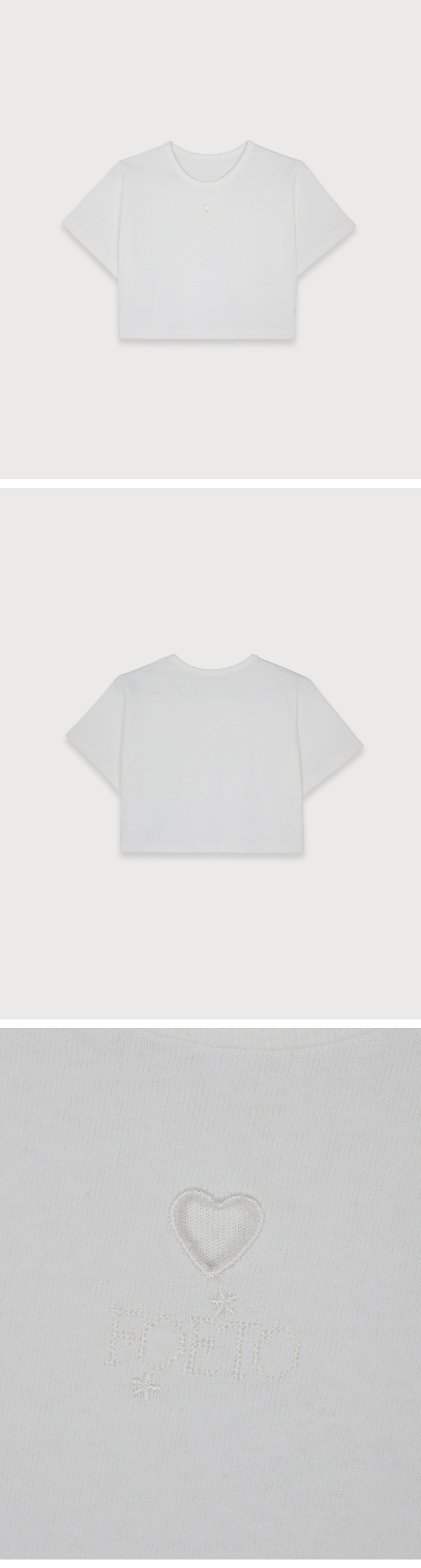 부드럽고 탄탄한 우수한 품질의 코튼 소재로 생산된 크롭 반팔 티셔츠입니다. 심플한 디자인이지만, 중앙의 미니멀한 하트펀칭과 테두리의 자수 그리고 바로 밑에 섬세하고 위트있는 로고와 플라워 자수 디테일이 돋보입니다. 여유있는 품과 소매기장 그리고 군더더기 없이 깔끔히 떨어지는 크롭 기장으로 다양한 하의와 플레잉 하시기 좋은 제품입니다.