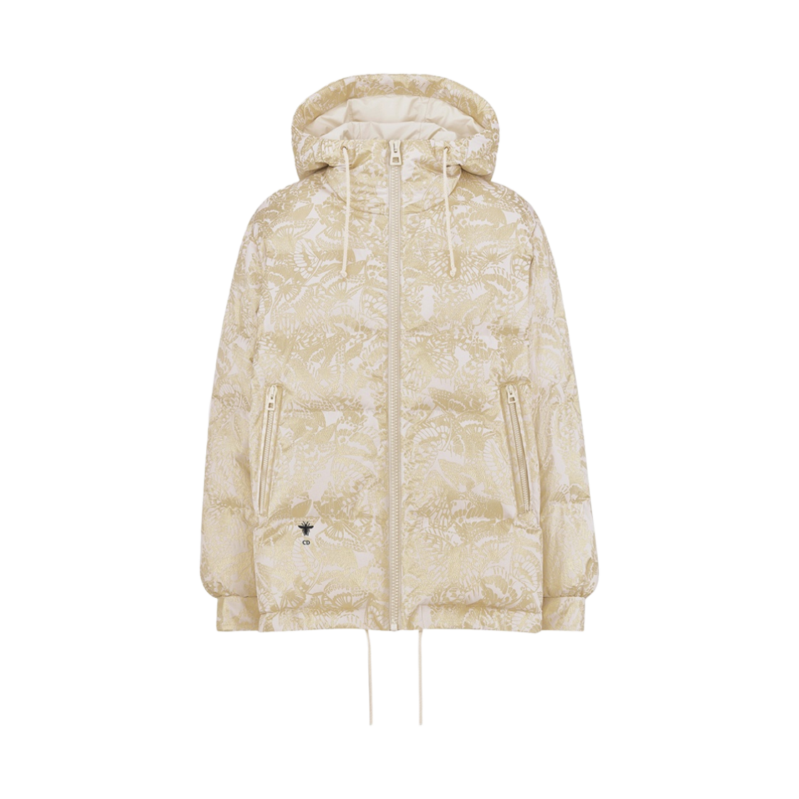 (W) Dior Dioralps Hooded Puffer Jacket White Quilted Technical Taffeta Gold Tone Allover Butterfly Motif