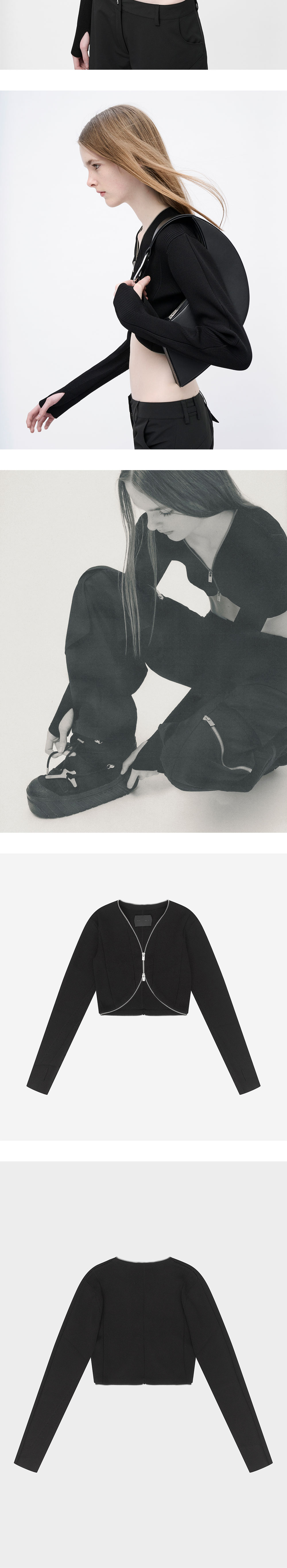 네크라인부터 밑단까지 이어진 곡선 형태의 지퍼 디테일이 특징인 엘리엇 에밀의 롱슬리브 니트입니다. - 크롭 슬림 핏 - 투웨이 지퍼