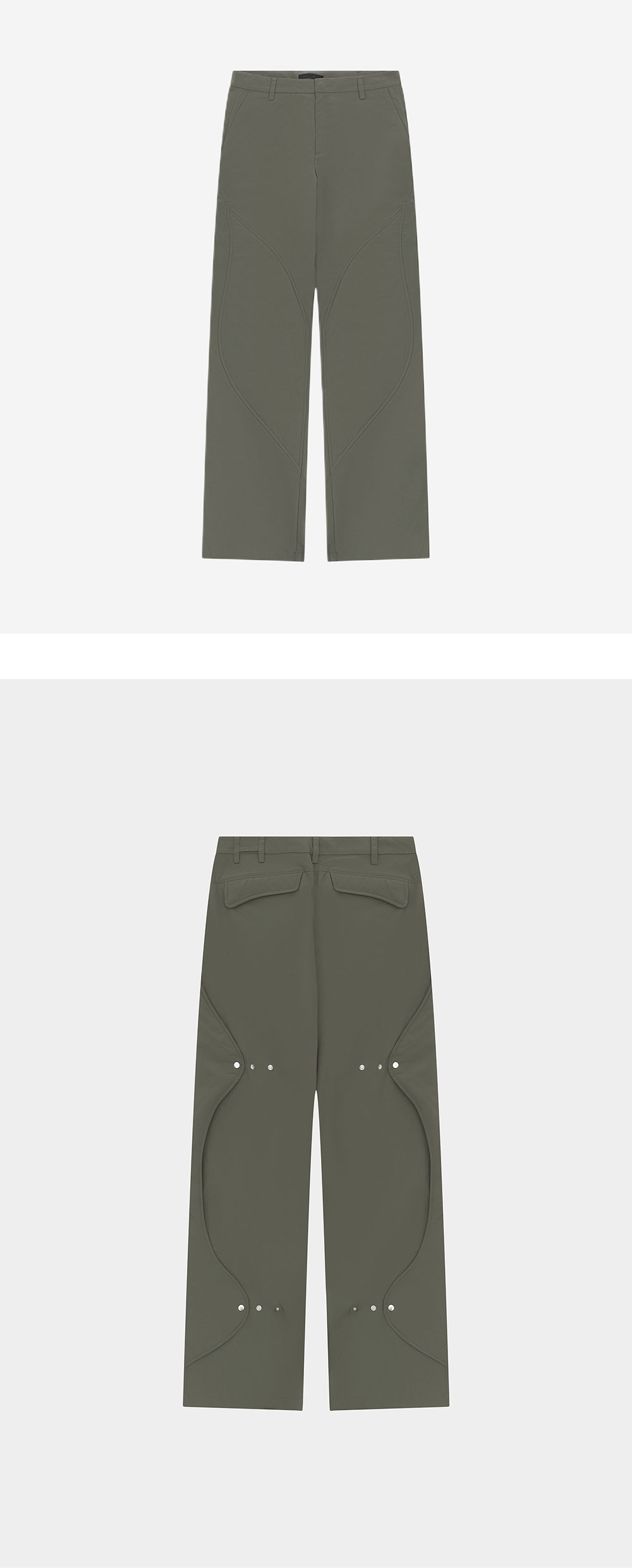 스냅 장식으로 핏 변형이 가능한 엘리엇 에밀의 모프드 패디드 트라우저입니다. - 전면 곡선 스티치 장식 - 후면 스냅 3개
