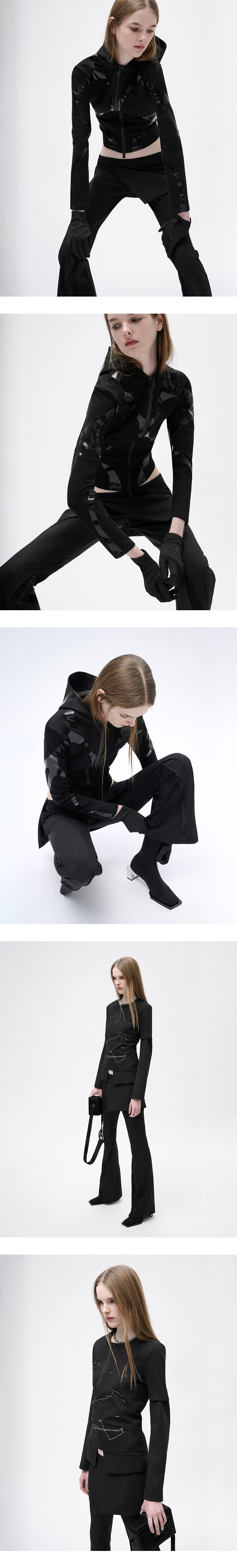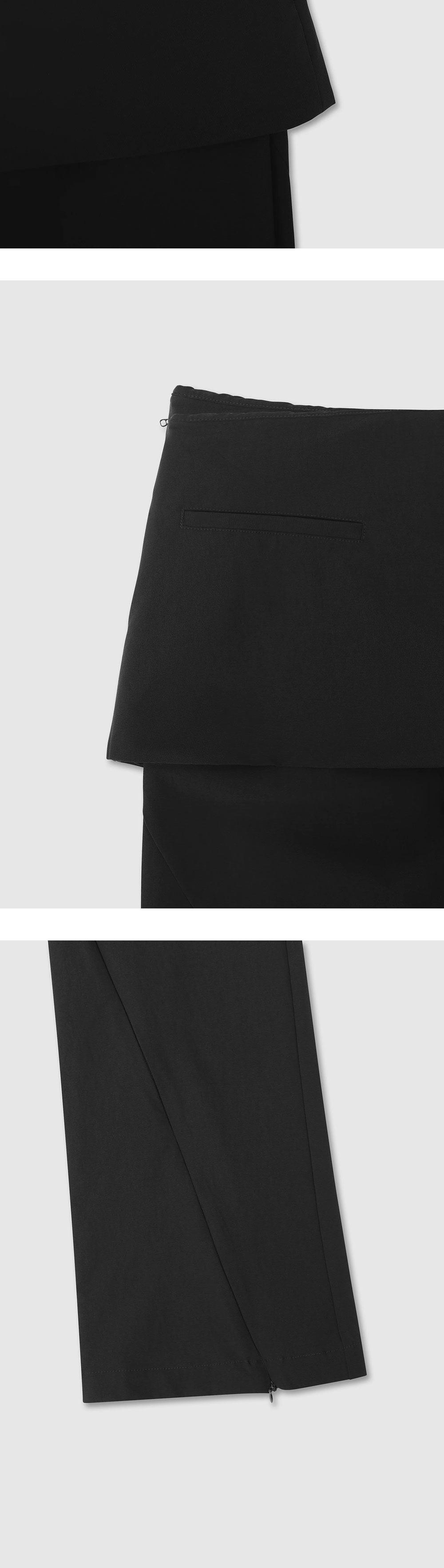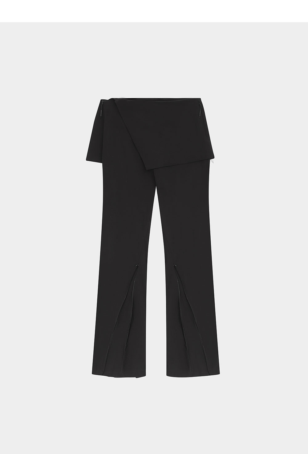 레이어드된 스커트와 지퍼 슬릿 디테일이 돋보이는 엘리엇 에밀의 부츠컷 스커트 트라우저입니다. - 슬림핏 테크니컬 스커트 팬츠 - 스커트 후면의 웰트 포켓