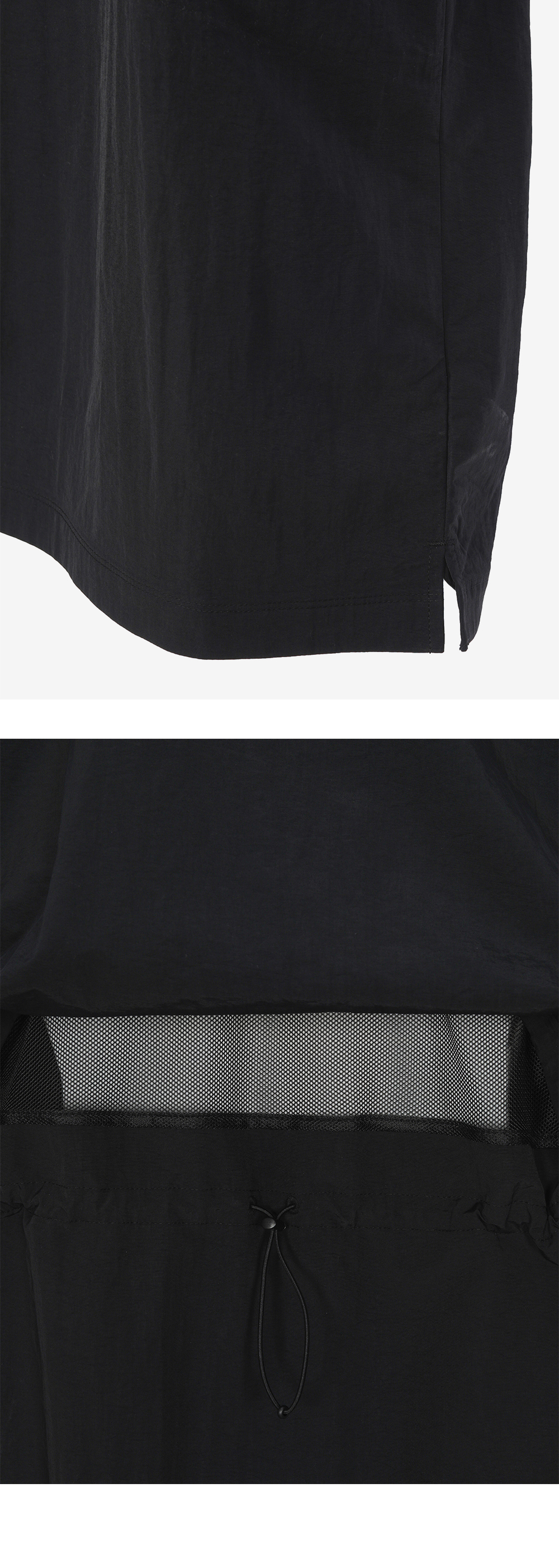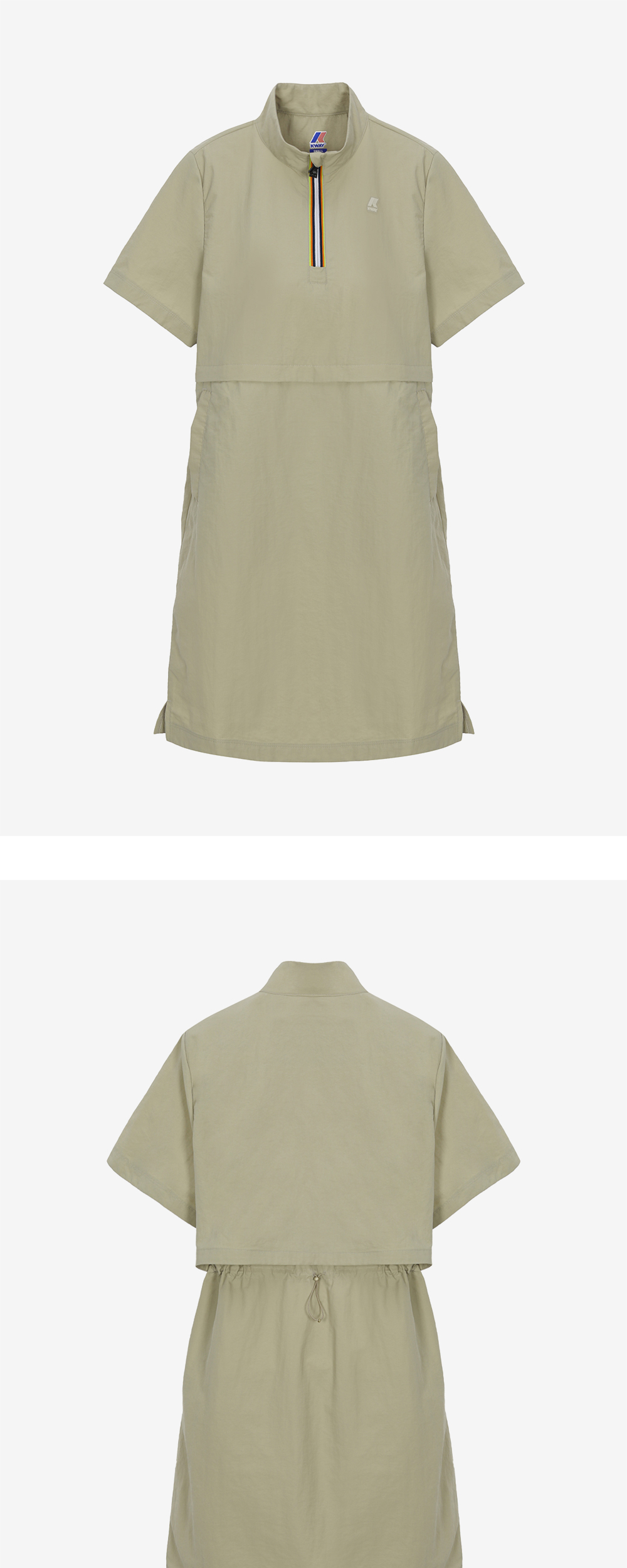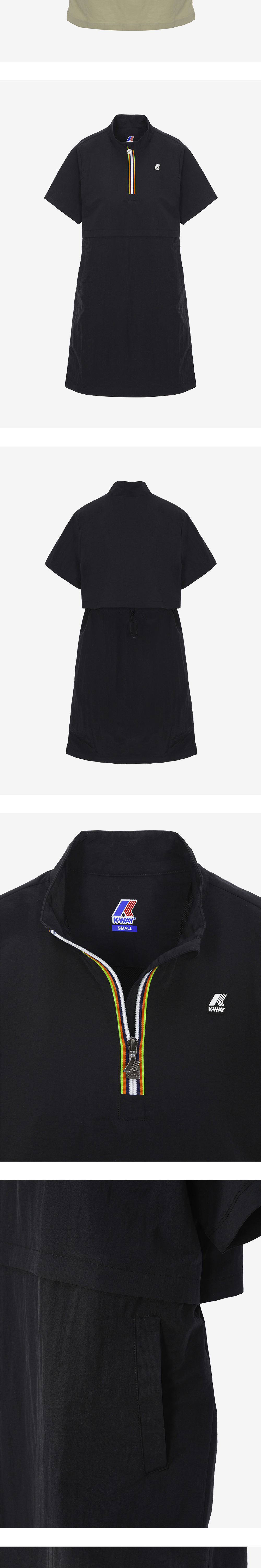 스탠드넥 형태의 아노락 원피스 측면 트임으로 편안한 움직임 까웨의 시그니처인 바야데르 지퍼 여밈 뒷면 벤틸레이션으로 통기성 우수 허리 스트링으로 핏 조절 가능 레귤러핏