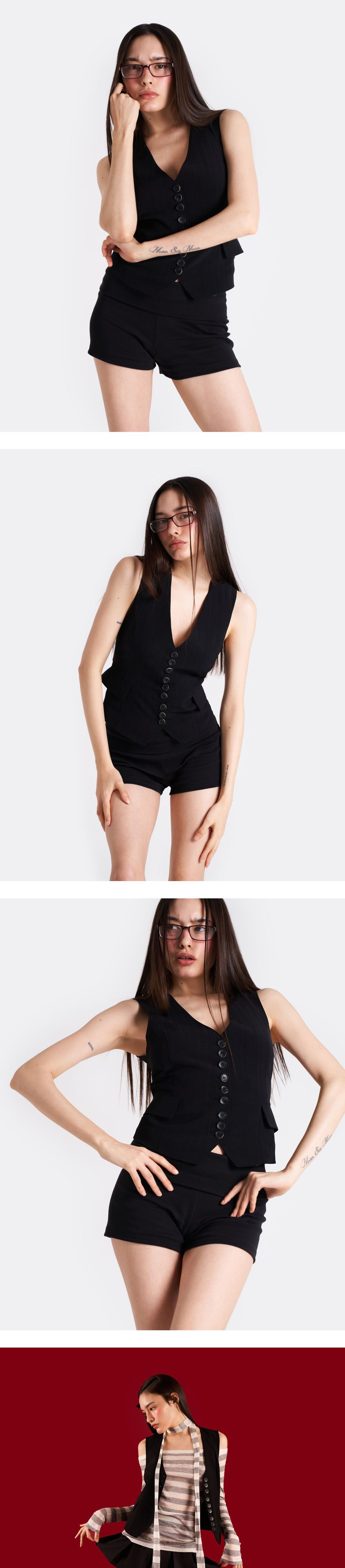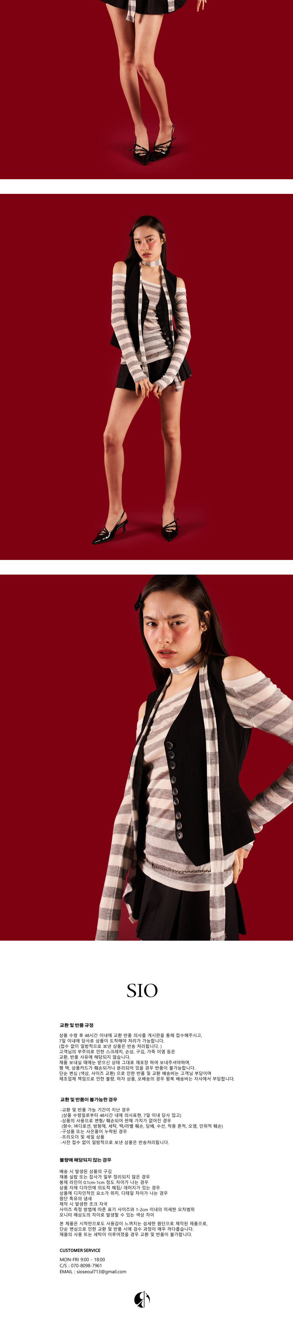 스트라이프 패턴의 쓰리 버튼 포인트의 베스트. 단독으로 또는 셔츠,탑과 레이어드해서 착용하기 좋은 베스트입니다. 프린세스 라인에 다트를 잡아 바디 실루엣을 더 잘보여주는 제품입니다. MODEL SIZE HEIGHT 168cm BUST 84cm WAIST 64cm HIPS 87cm
