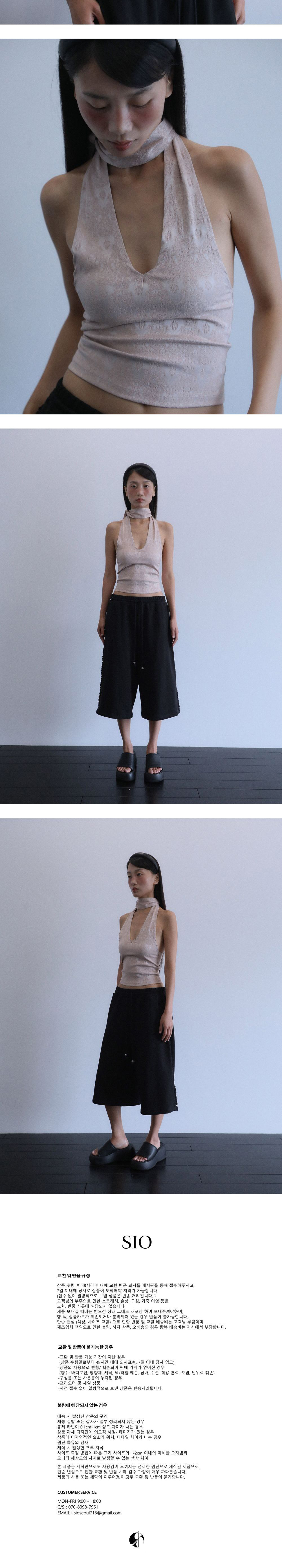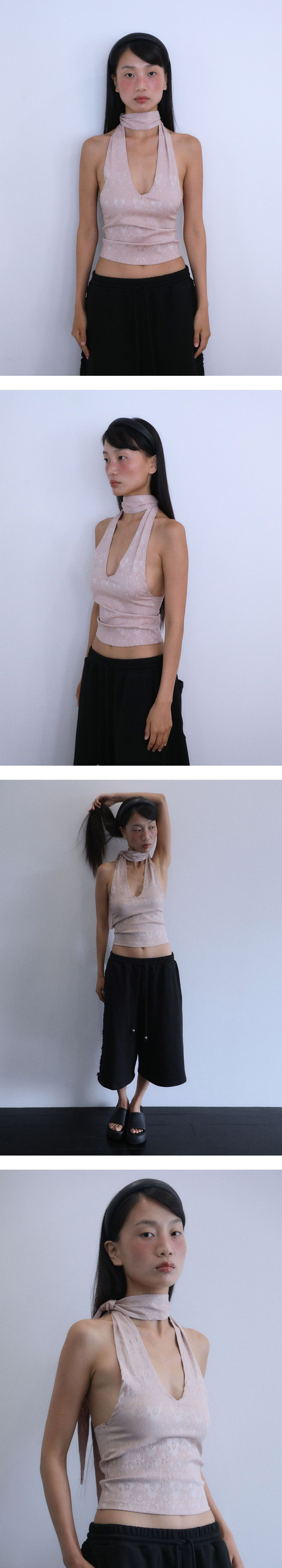 신축성 좋은 자카드 소재의 브이넥 홀터 탑입니다. 얇은 스판 제질이지만 탄탄하게 바디를 잡아줘 핏하게 연출이 가능한 디자인입니다. 넥라인으로 이어지는 긴 스트랩으로 끈을 짧게 또는 길게 스타일링 할 수 있습니다. 스트랩을 활용하여 홀터넥, 베스트 등으로도 활용할 수 있게 디자인 된 제품입니다. 전 시즌의 브이넥 홀터 슬리브리스 탑과 같은 디자인이지만 다른 무드로 활용이 가능한 제품입니다. Model Size : 170cm / Bust 33” / Waist 24” / Hips 34”