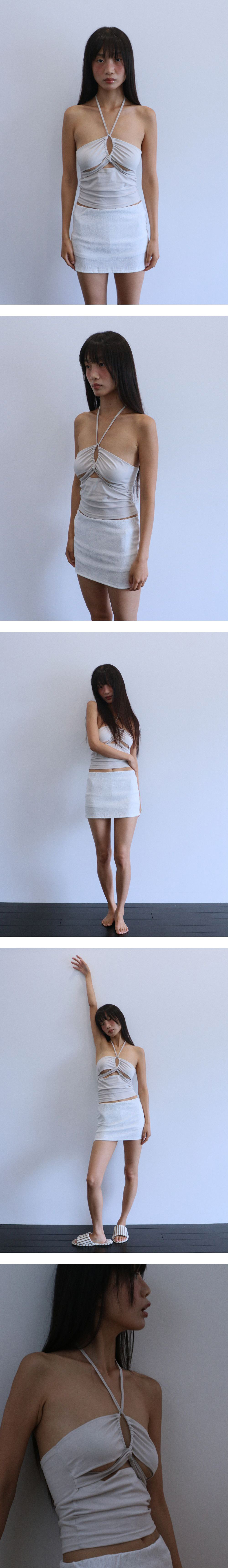 이전 시즌 많은 사랑을 받았던 스트링 홀터 탑. 긴 기장의 스트링으로 취향대로 스타일링하여 연출할 수 있습니다. 배꼽 밑까지 오는 기장으로 단독으로 또는 이너 탑 제품과 함께 착용할 수 있습니다. 앞면에 실리콘을 덧대어 흘러내림을 더욱 방지해주는 디테일을 추가했습니다. Model Size : 170cm / Bust 33” / Waist 24” / Hips 34”