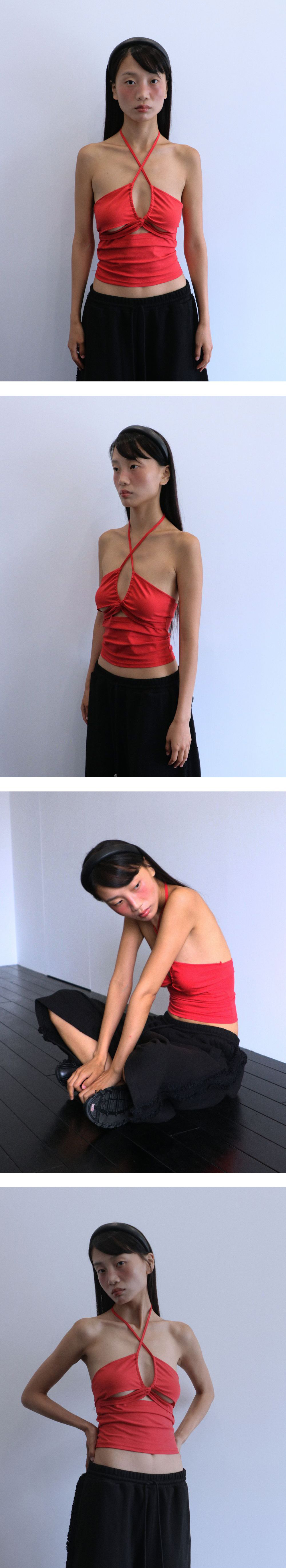 이전 시즌 많은 사랑을 받았던 스트링 홀터 탑. 긴 기장의 스트링으로 취향대로 스타일링하여 연출할 수 있습니다. 배꼽 밑까지 오는 기장으로 단독으로 또는 이너 탑 제품과 함께 착용할 수 있습니다. 앞면에 실리콘을 덧대어 흘러내림을 더욱 방지해주는 디테일을 추가했습니다. Model Size : 170cm / Bust 33” / Waist 24” / Hips 34”