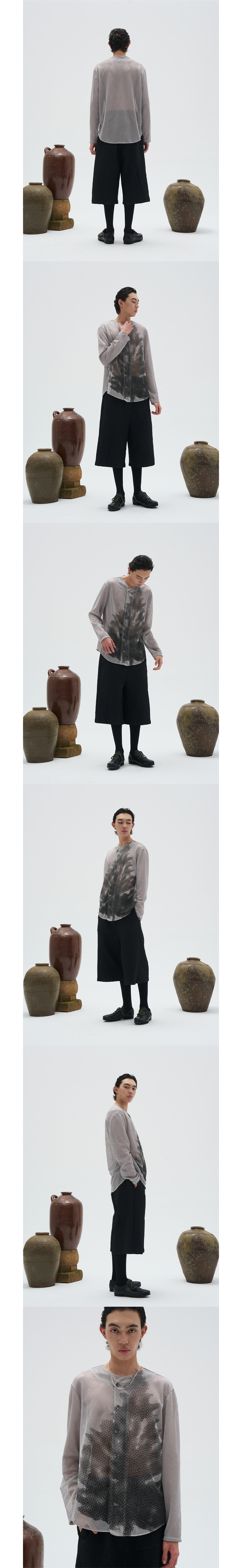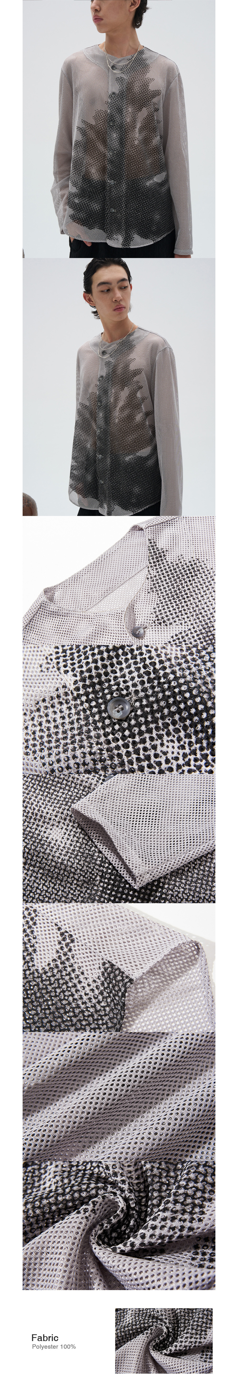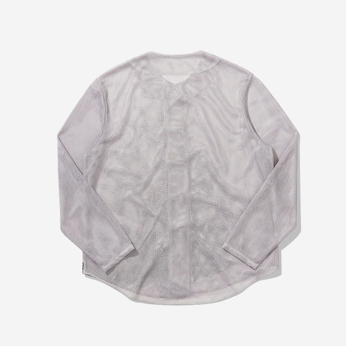 ● 하프톤 패턴 + 빅 메쉬 원단 사용 ● 긴 슬리브의 베이스볼 가디건 ● 블랙 패턴 레진 단추 사용 ● 맨 살에도 거부감이 없는 스킨-프렌들리 가공