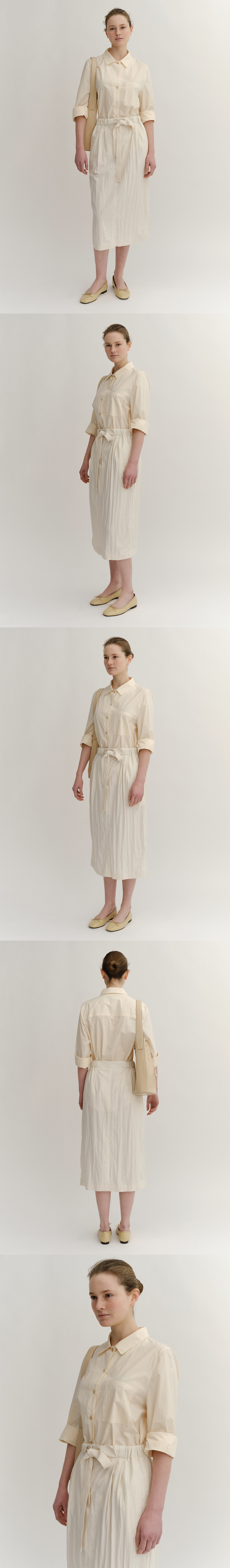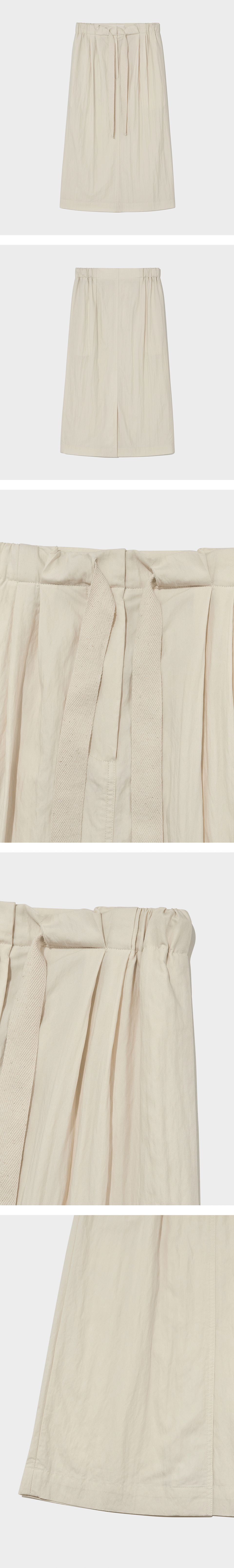 스트링 디테일의 이지웨어 스커트. 부드러운 가먼트 다이 바이오 워싱, 앞면 Tuck 디테일의 스트레이트 실루엣, 앞중심 오픈지퍼로 여밈, 웨이스트 스트링 디테일, 미디 기장의 스트레이트 핏.