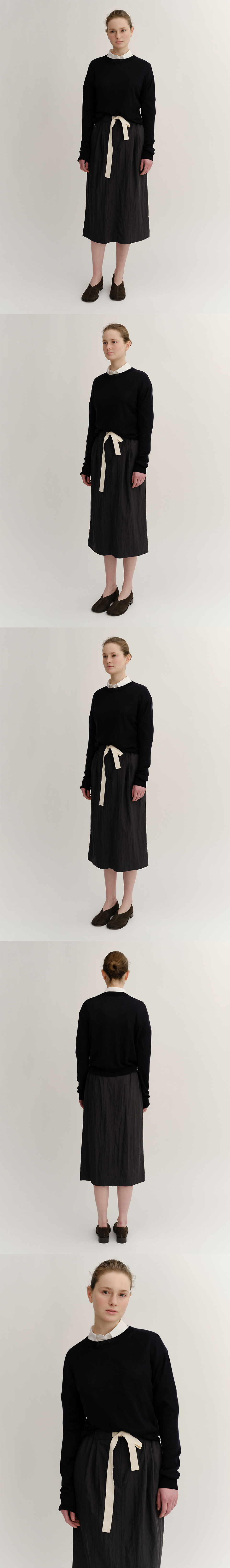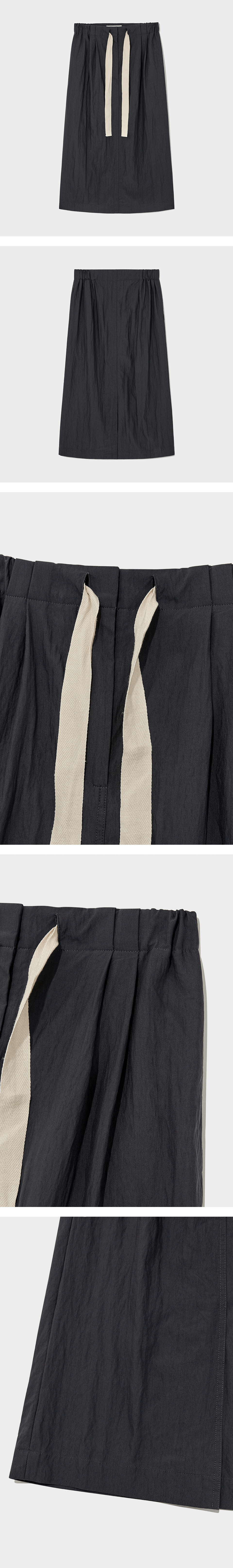 스트링 디테일의 이지웨어 스커트. 부드러운 가먼트 다이 바이오 워싱, 앞면 Tuck 디테일의 스트레이트 실루엣, 앞중심 오픈지퍼로 여밈, 웨이스트 스트링 디테일, 미디 기장의 스트레이트 핏.